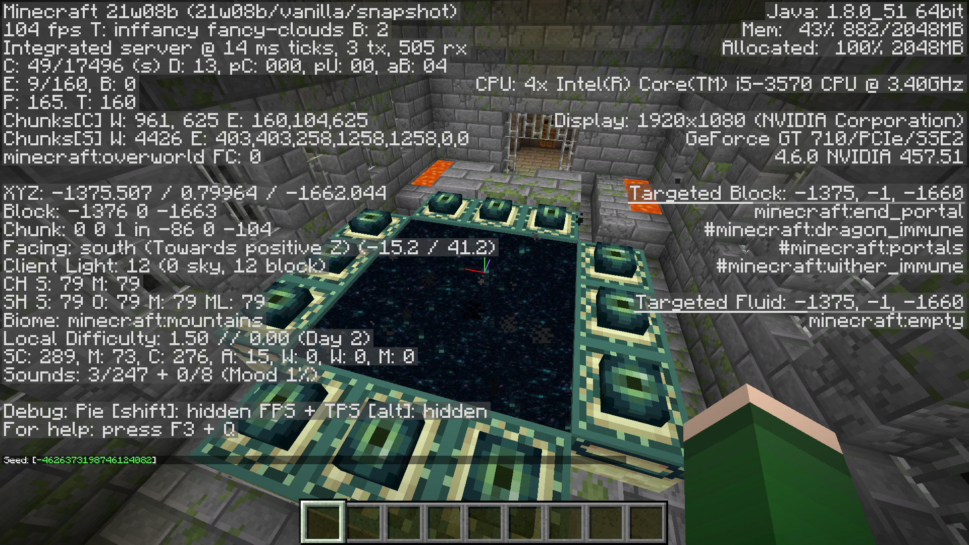 The world was generated in 20w08a, but the portal and stronghold were generated in 20w08b. I did not throw any ender eyes while in 20w08a.