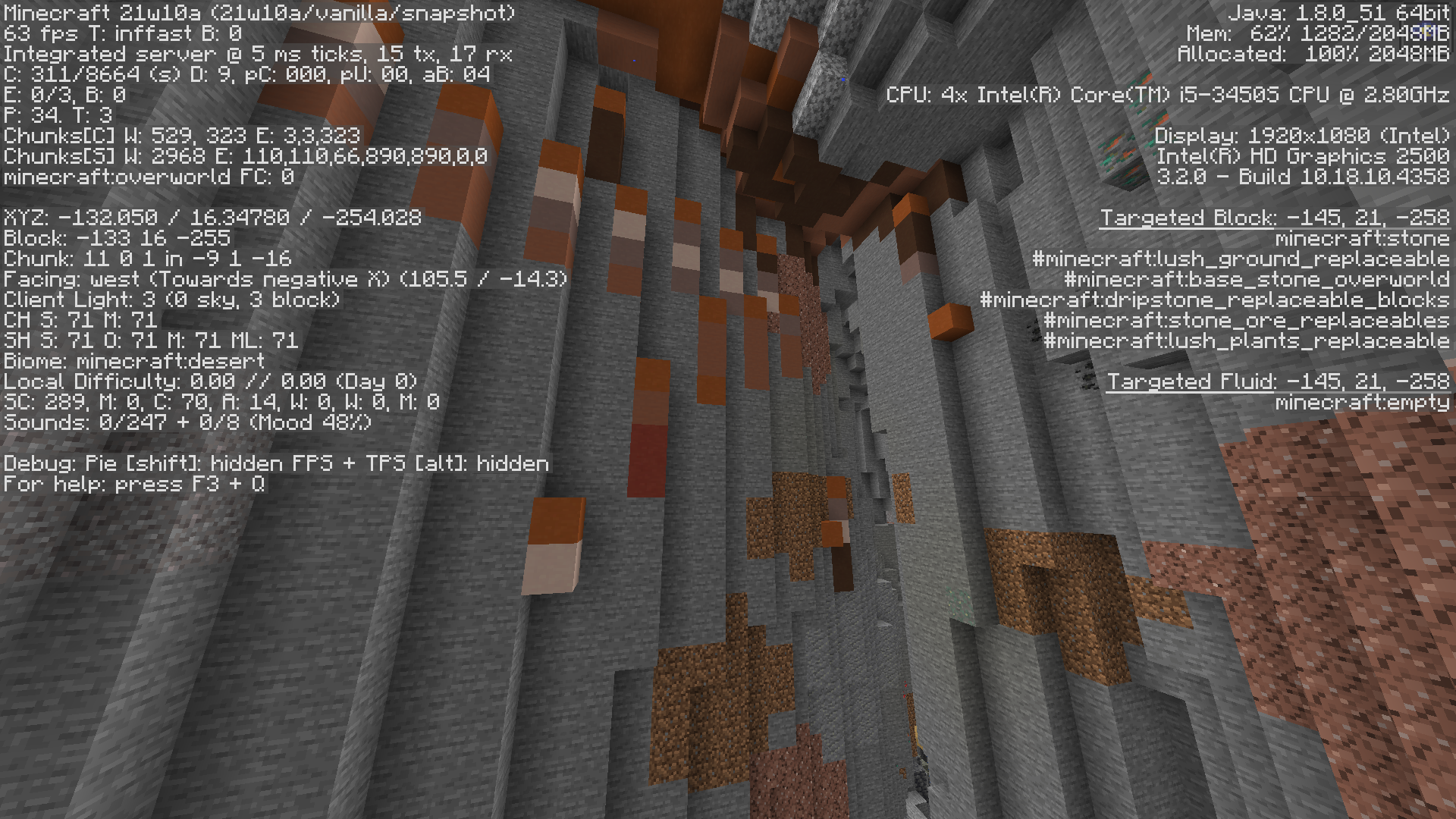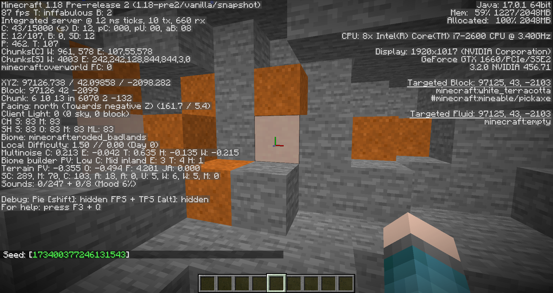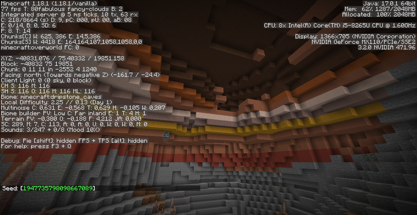 Generation bug where in badlands biomes, terracotta generates in caves deep enough where its obvious its not supposed to be there (y=18 in the screenshot provided.) In this case it generated near an aquifer, I'm not sure if that's aquifer specific or it happens in other cases as well.