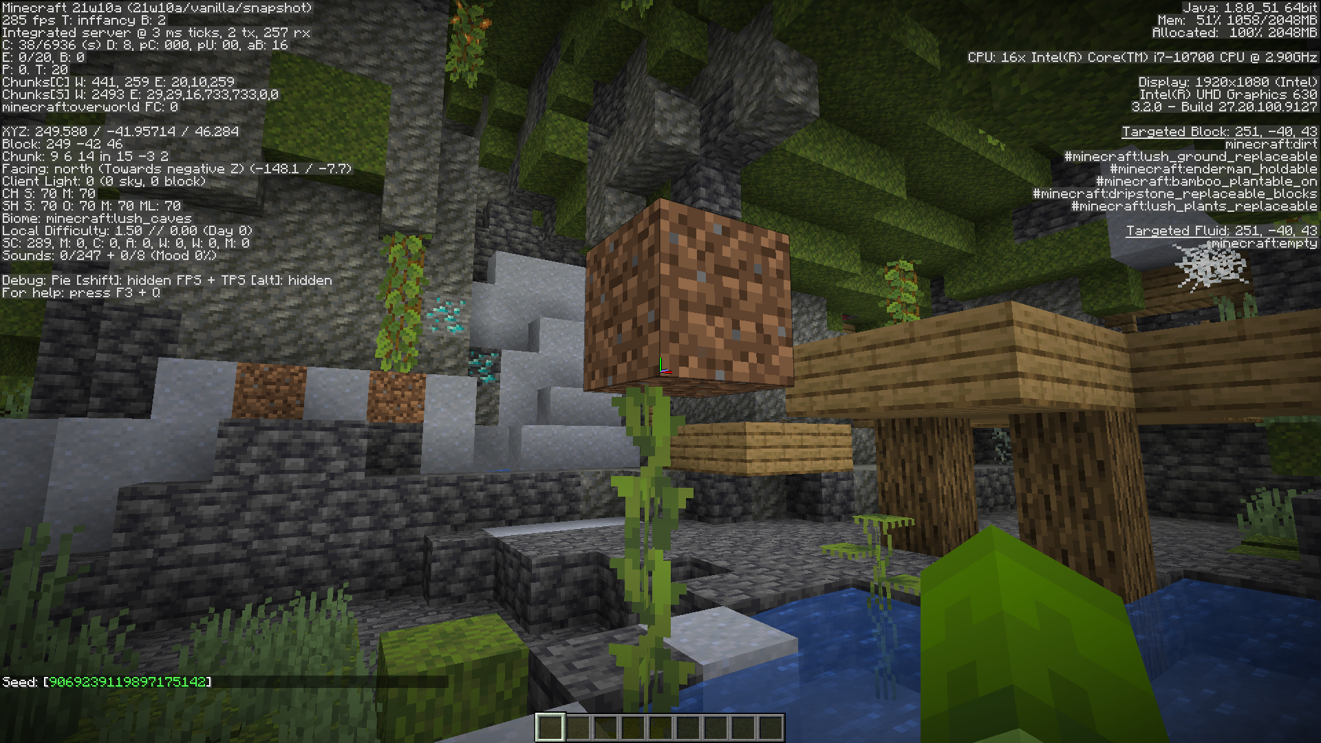 In the lush caves biome, blocks can generate on top of the dripleaf plant and cut off the pad part of it.