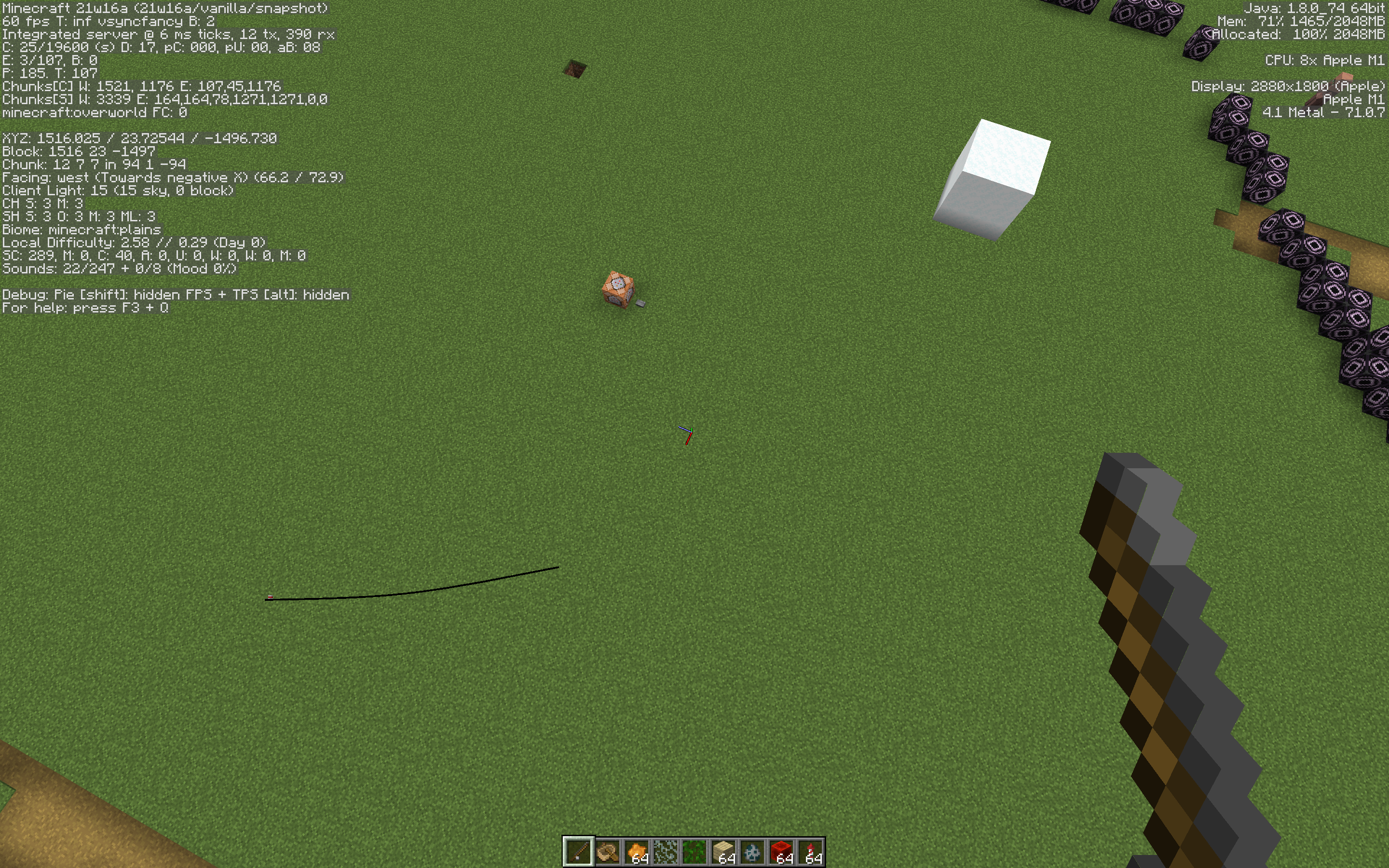 A cast fishing line is rendered much further from the fishing rod, while in first person view, than it was in previous versions. In 21w08b, a player casting a fishing line could expect to see it very close to the fishing rod item in their hand, regardless of the distance between the player and the fishing hook: