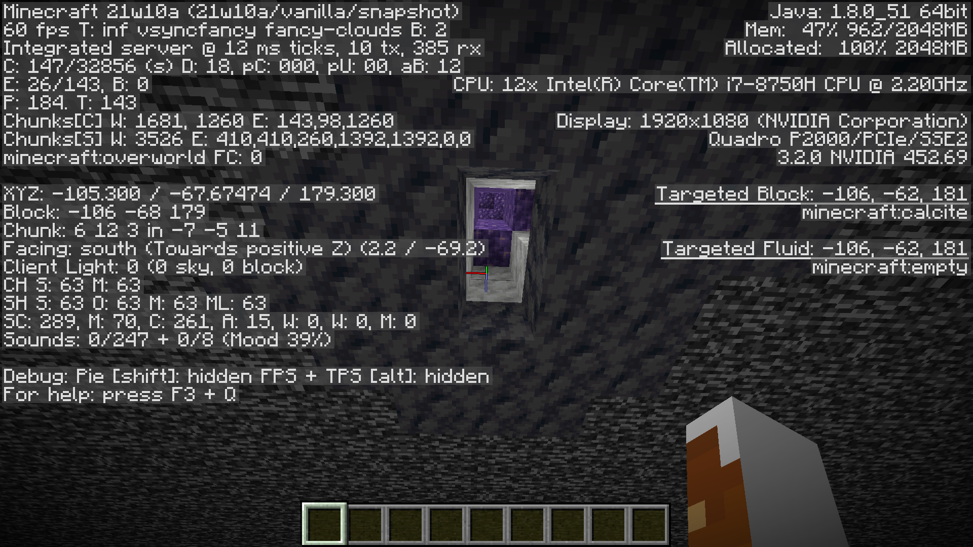 I found quite a big bug in my Minecraft word on snapshot 21w10a. World seed is 6726078724493128491 and coordinates are -106 -64 179. You can see an amethyst geode breaking bedrock.