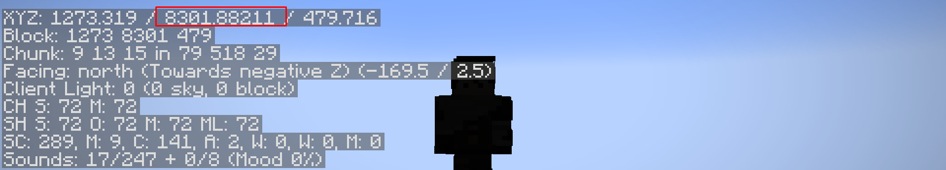 With those things in mind i though that there could be bad generated blocks above the area so i started using /tp MyName ~ 100+ ~, after messing around with it i found out the Pitch black appears at exactly 8300-Y axis, if you stay at 8302(Character height) it will not turn black as if we were in a cave, but at 8301 (legs in the 8300) we turn black as if the shadow in the area is glitched. (Screenshot_868 / Screenshot_869)