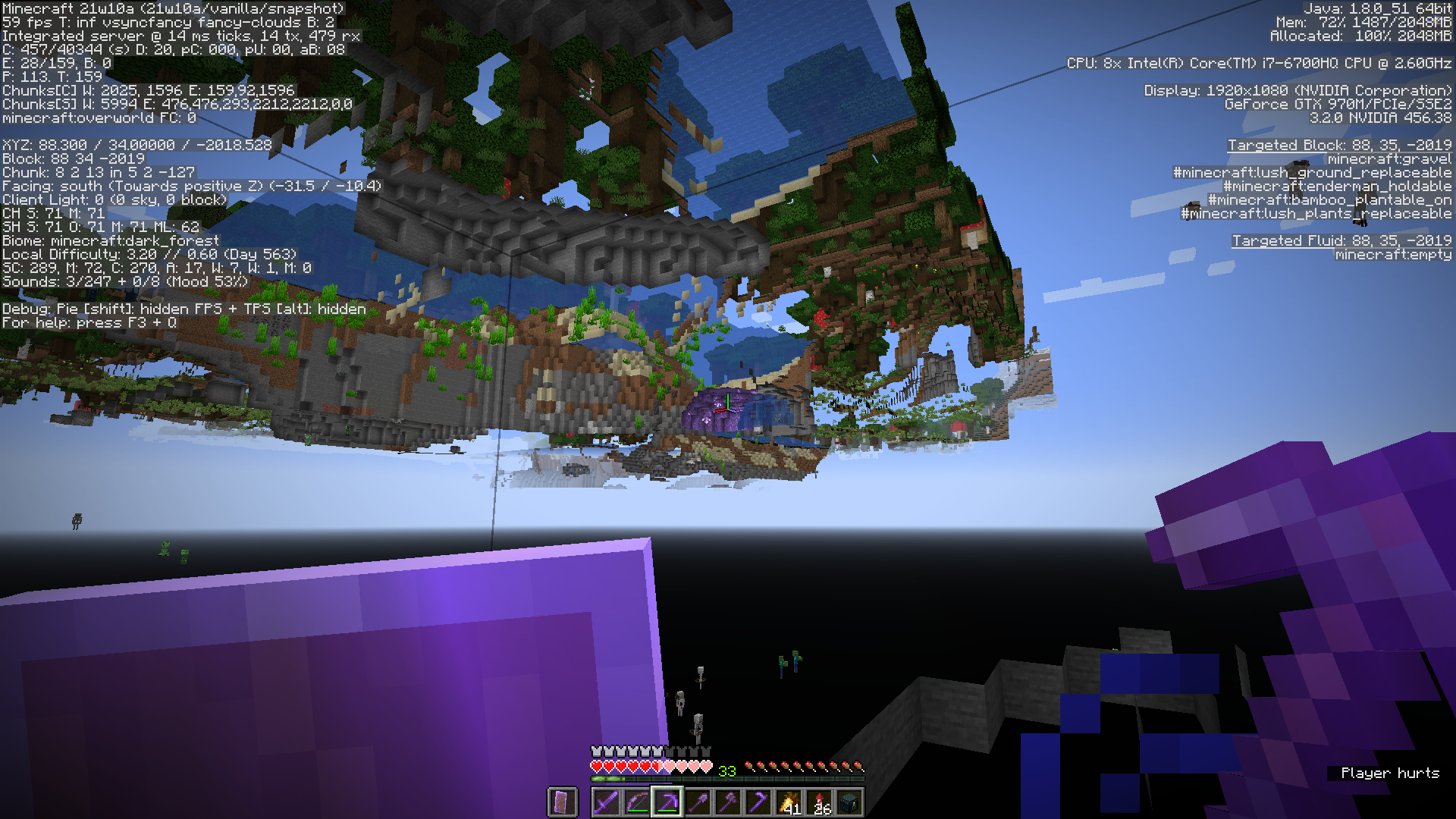 While mining, a column of gravel fell onto me, completely covering me. Instead of the normal "suffocating" texture that blocks everything, I was able to see through the blocks, essentially able to x-ray the environment.