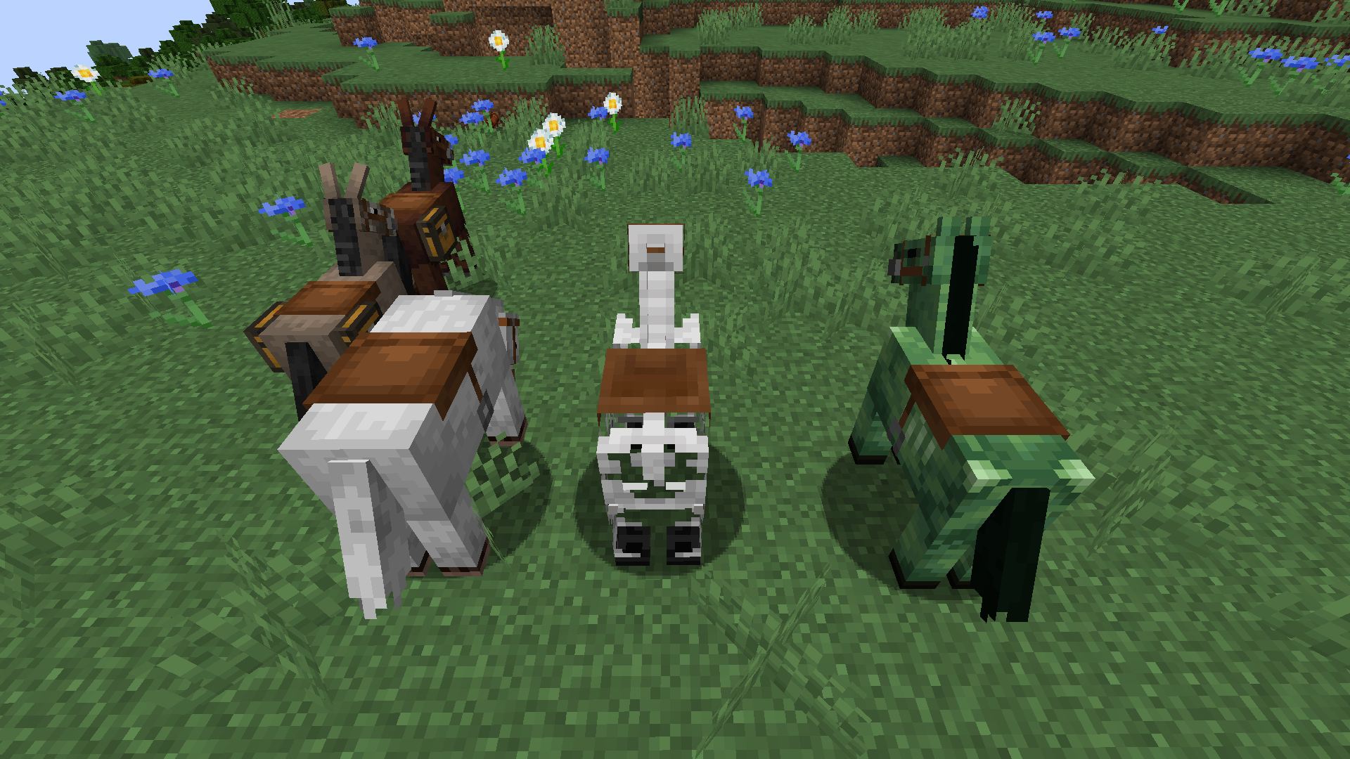 Bits of the Donkey and Mule's saddles have stray pixels on them that seem to match up with the Donkey and Mule's fur colors respectively, gray on the Donkey and brown on the Mule, clearly indicating a mistake (fur/flesh wouldn't be on a saddle texture when none of the other horses have it)