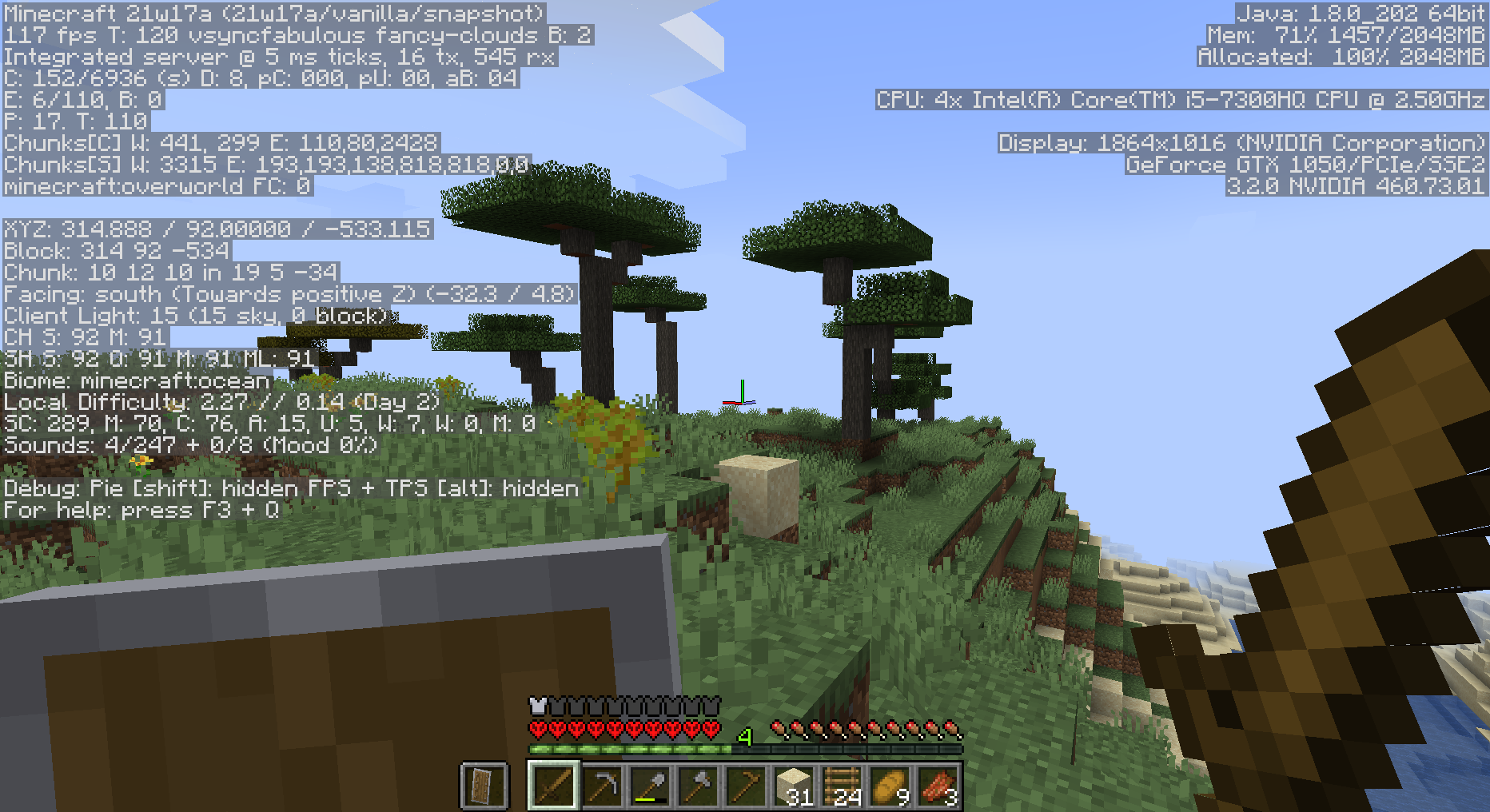 Today I started a Large Biomes world and began building in a Savannah. After briefly leaving the Savannah biome and returning, the biome had changed to an ocean biome. All the original terrain remained, but now the grass and leaf colors had changed.