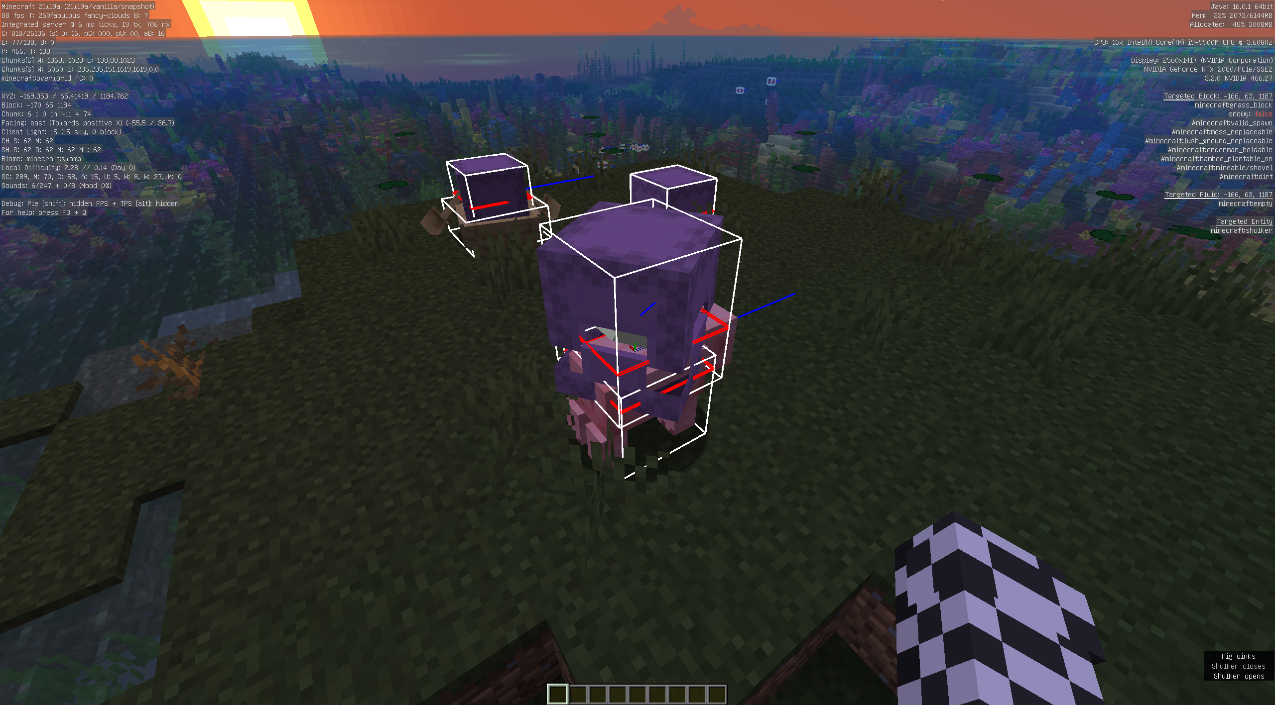/summon minecraft:armor_stand ~ ~ ~ {NoGravity:1b,Passengers:[{id:shulker}]}/summon minecraft:armor_stand ~ ~ ~ {NoGravity:1b,Passengers:[{id:shulker}]}Can also confirm in 21w37a. The expected behavior here would be that shulker shells cannot rotate whilst riding entities.