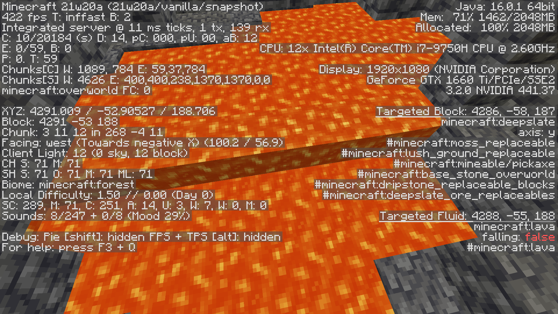 When I was looking around for a end portal room in a stronghold in one of my worlds, I came across 2 layers of non-flowing lava. The seed is -1133765157981061987. The seed for the 21w20a is -5758760364720378710