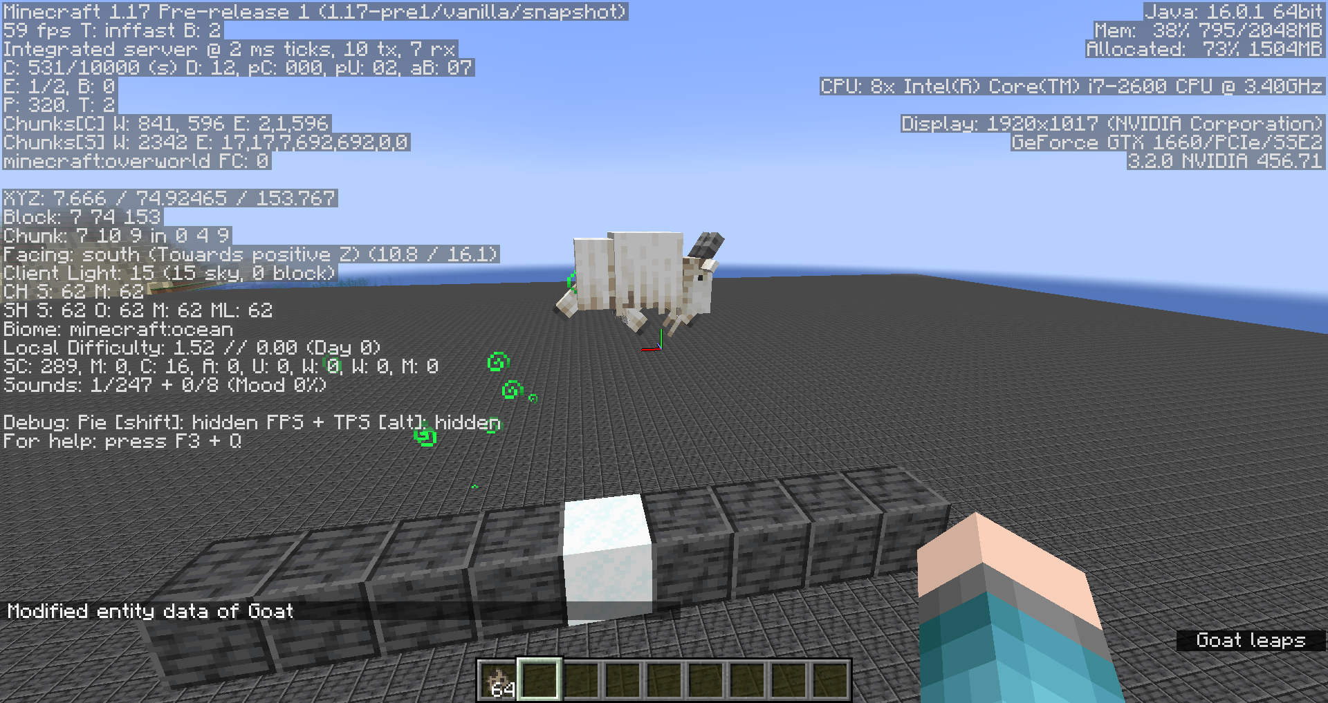 /execute as @e[type=minecraft:goat,limit=1,sort=nearest] run data modify entity @s Brain.memories."minecraft:long_jump_cooling_down".value set value 1/execute as @e[type=minecraft:goat,limit=1,sort=nearest] run data modify entity @s Brain.memories."minecraft:long_jump_cooling_down".value set value 1→ ✔ Notice how the goat performs a long jump. Take note of how high it jumps.