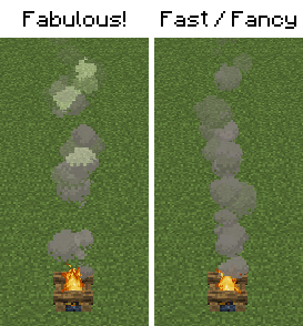 With Fabulous! graphics mode activated, some smoke particles from the campfire fade white when overlapping each other.
