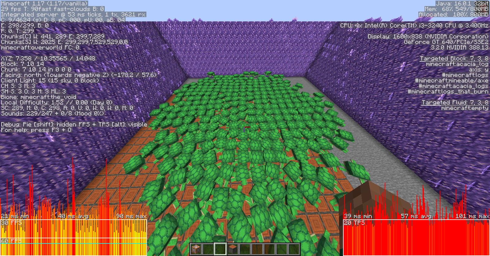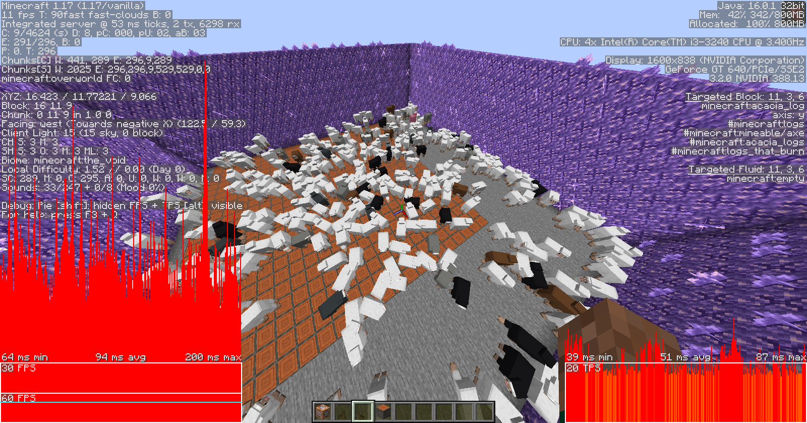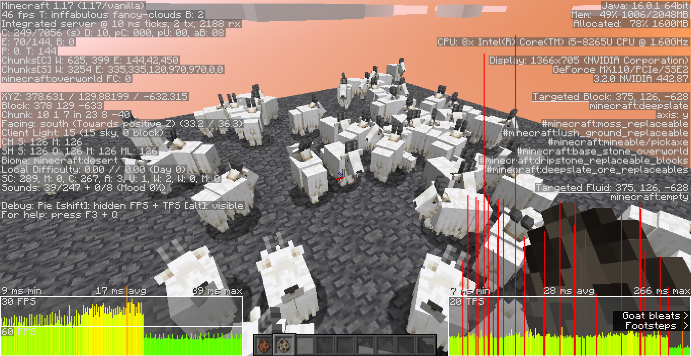 Goats are even laggier than axolotls. Just about 80 goats is enough to drop 80 fps to 30 fps and bring the server to about 22 MSPT average. This is more or less the same impact that 300 axolotls have on my computer.