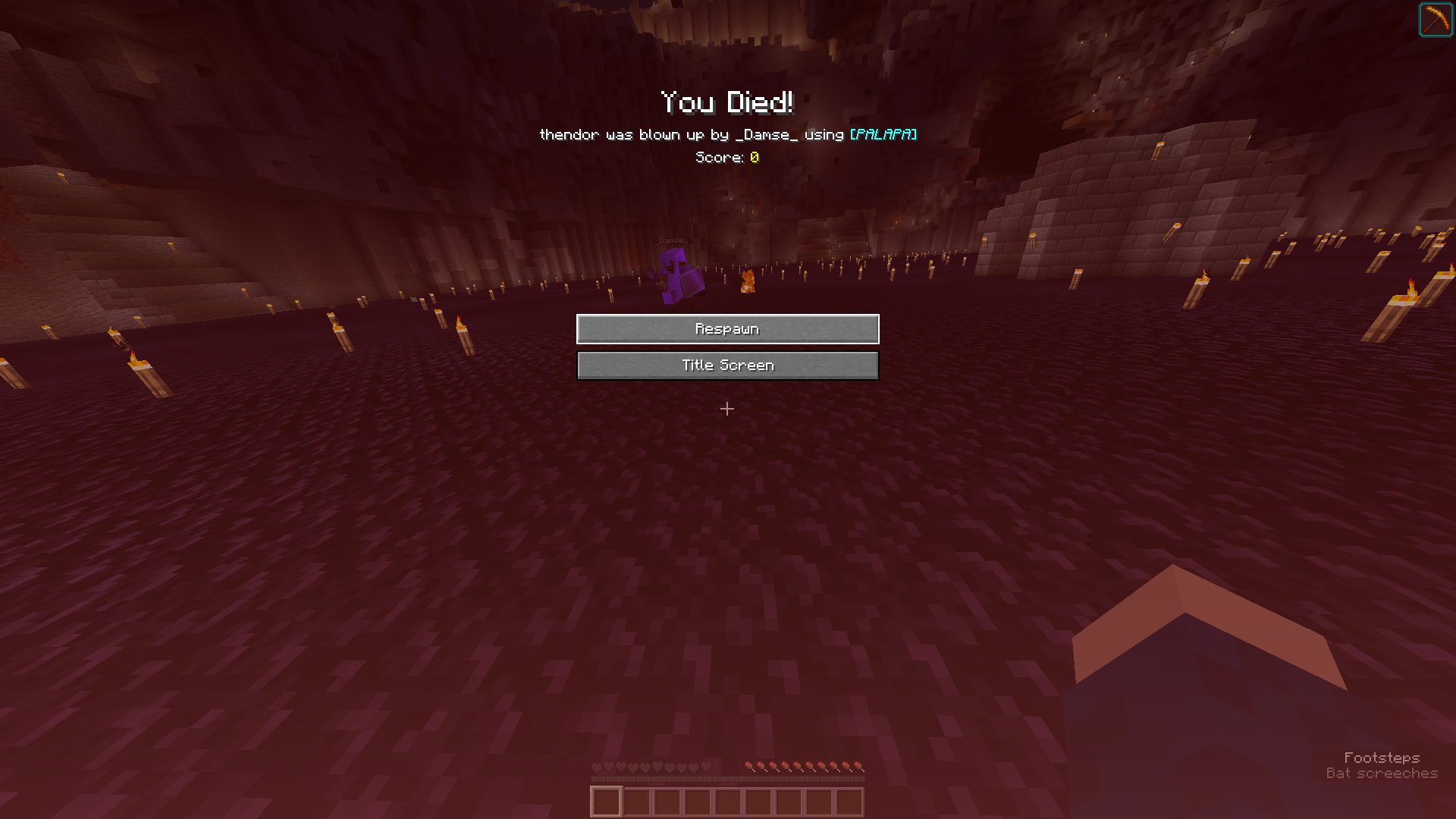 In the screenshot attached, the message is displayed prompting "(...) blown by [PALAPA]". PALAPA happens to be the name of the shovel of my friend, which he equiped after shooting the initial TNT with a flamming arrow.