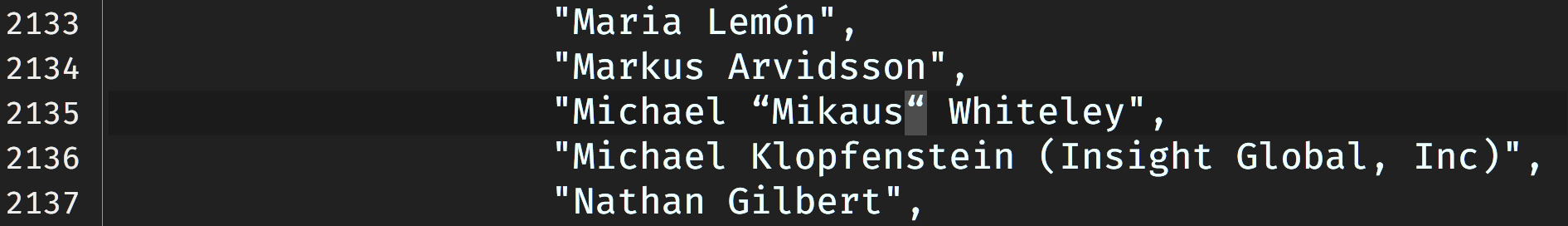 The symbol on line 2135, column 37 (position 70675) in assets/minecraft/texts/credits.json is a left double quotation mark (“, U+201C), instead of a right double quotation mark (”, U+201D)
