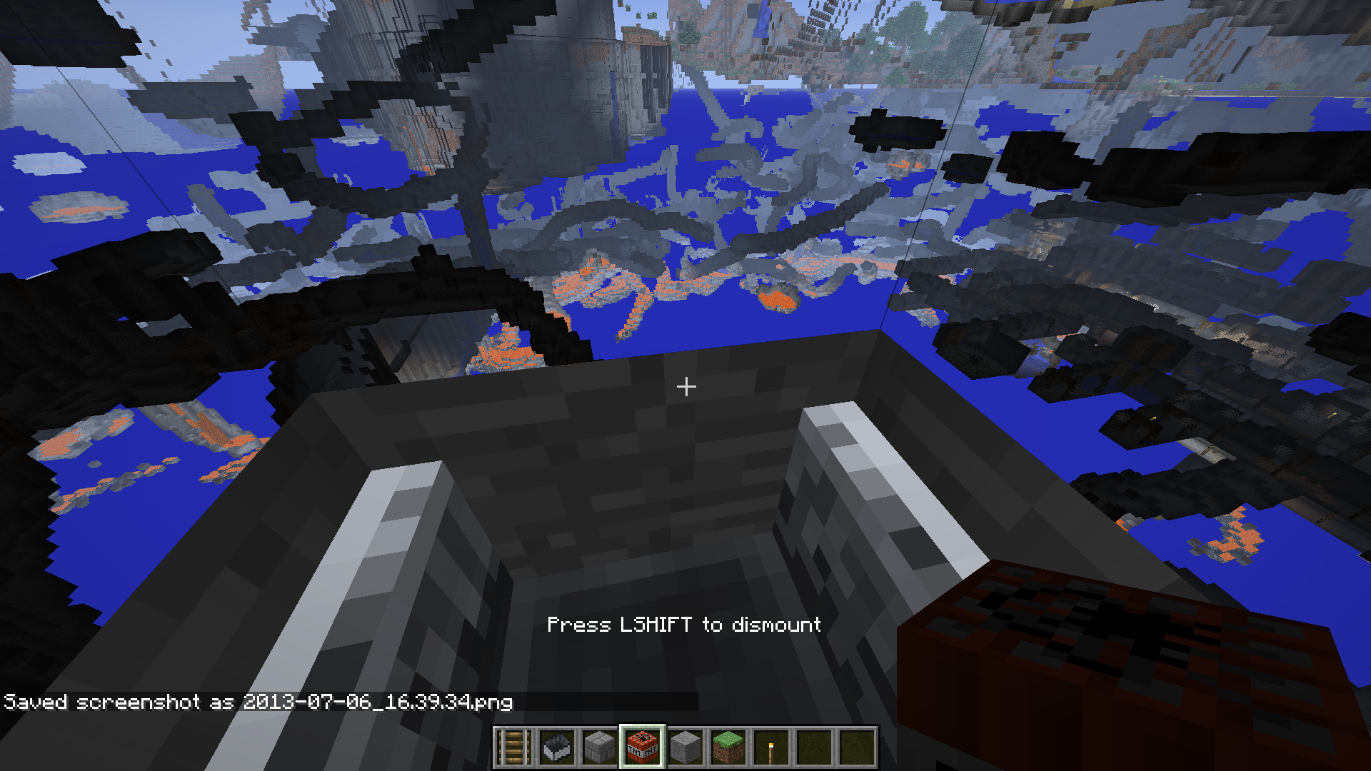 See screenshots. If you place down a rail, a tnt on top of the rail and a normal minecart onto the rail, you can see caves by entering the minecart.