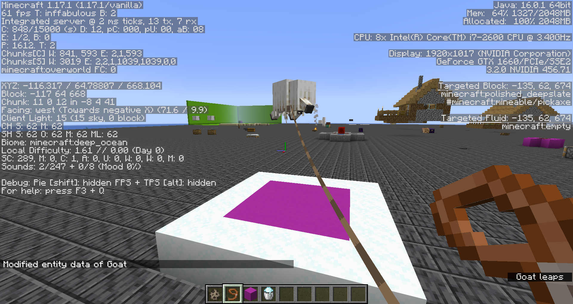 /execute as @e[type=minecraft:goat,limit=1,sort=nearest] run data modify entity @s Brain.memories."minecraft:long_jump_cooling_down".value set value 1/execute as @e[type=minecraft:goat,limit=1,sort=nearest] run data modify entity @s Brain.memories."minecraft:long_jump_cooling_down".value set value 1Take note as to whether or not goats can perform long jumps when attached to leads.