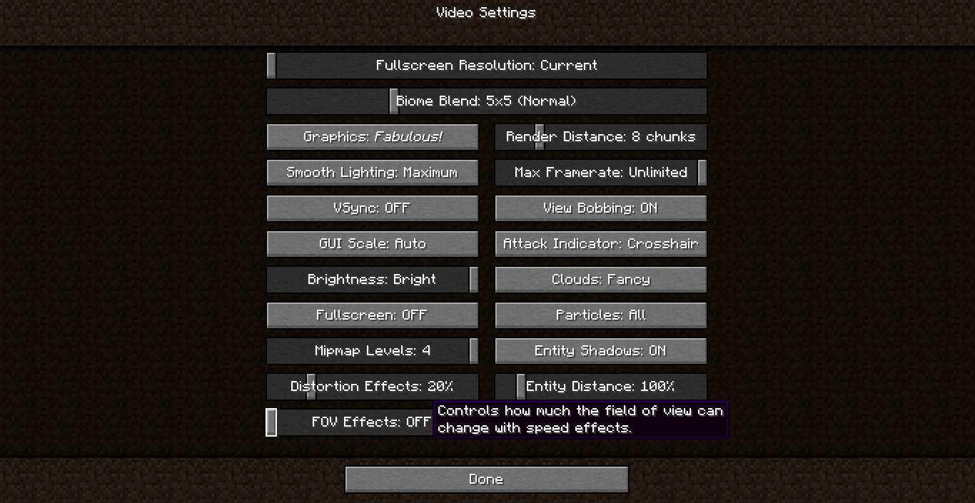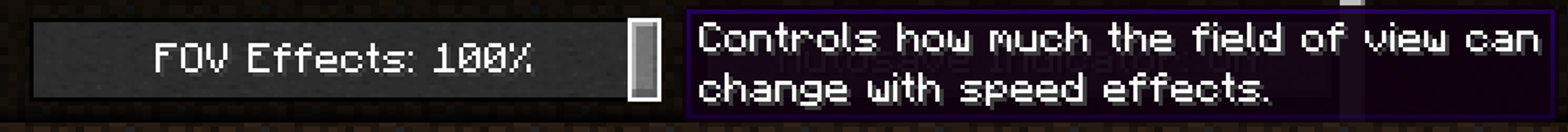 The current description for the "FOV Effects" setting is "Controls how much the field of view can change with speed effects". However, it actually controls all FOV changes; for example, those caused by freezing (which is arguably not necessarily a speed effect) or entering/exiting liquids.