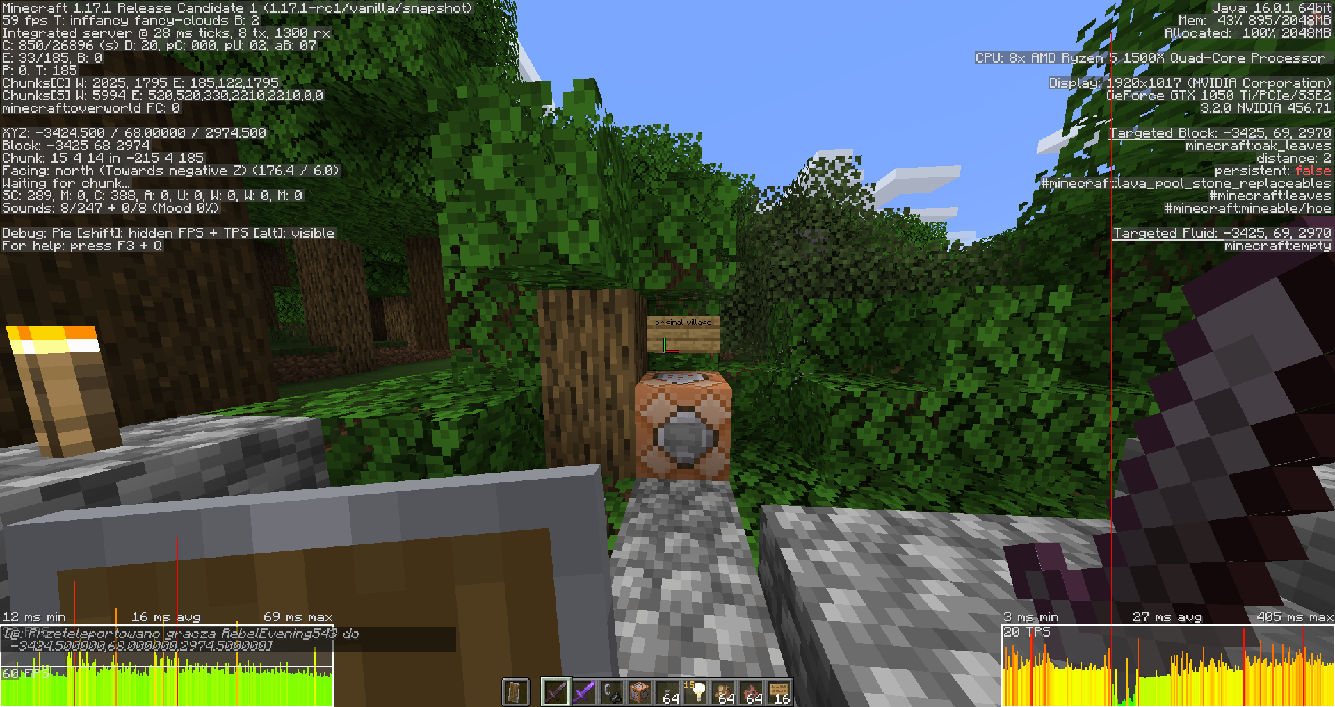 If you use /tp command to teleport a ton of blocks away while you have Alt + F3 debug screen enabled, you will see massive lag spikes.