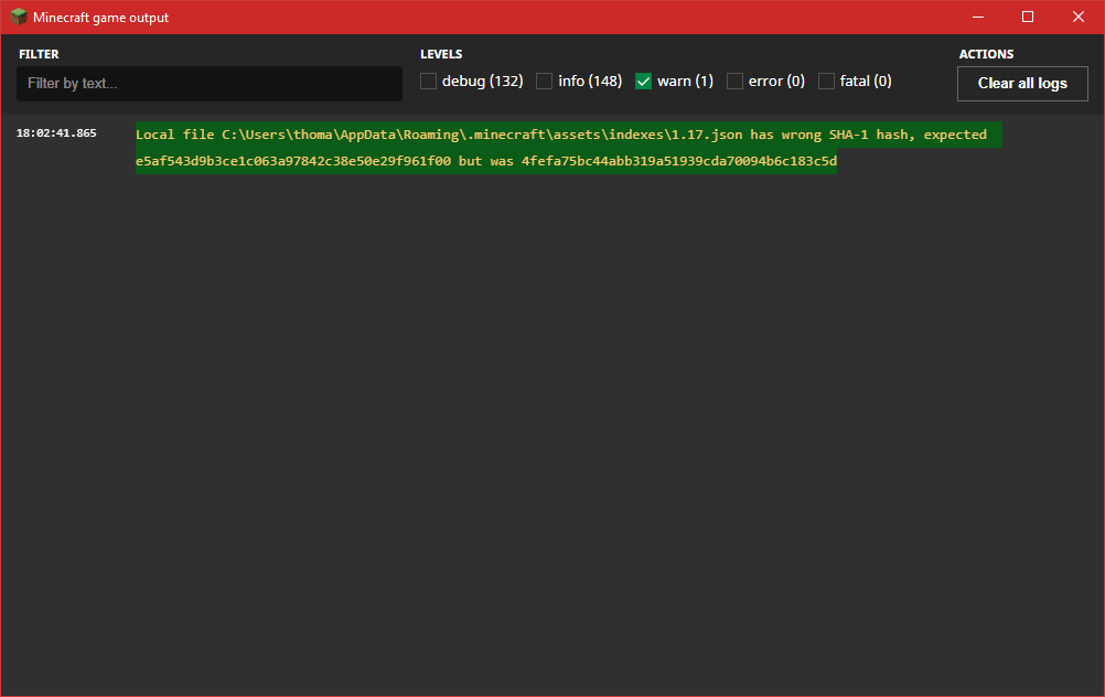 Local file C:\Users\thoma\AppData\Roaming\.minecraft\assets\indexes\1.17.json has wrong SHA-1 hash, expected e5af543d9b3ce1c063a97842c38e50e29f961f00 but was 4fefa75bc44abb319a51939cda70094b6c183c5d