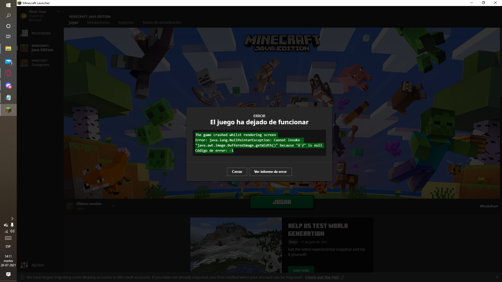 intento ingresar a las configuraciones de minecraft realms y me crache el minecraft y se cierra saltando este error "The game crashed whilst rendering screen