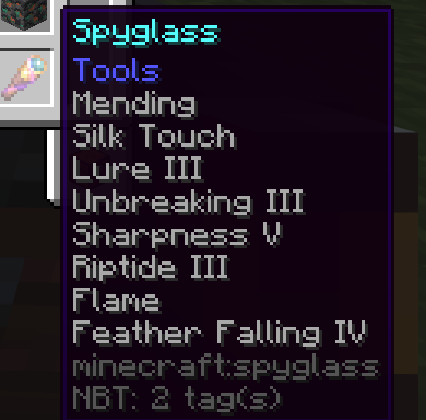 With an Anvil and Enchanted Books, you are able to Enchant the Spyglass item with enchantments that are not meant for that tool. (Ex. Silk Touch, Flame, Riptide, Etc)