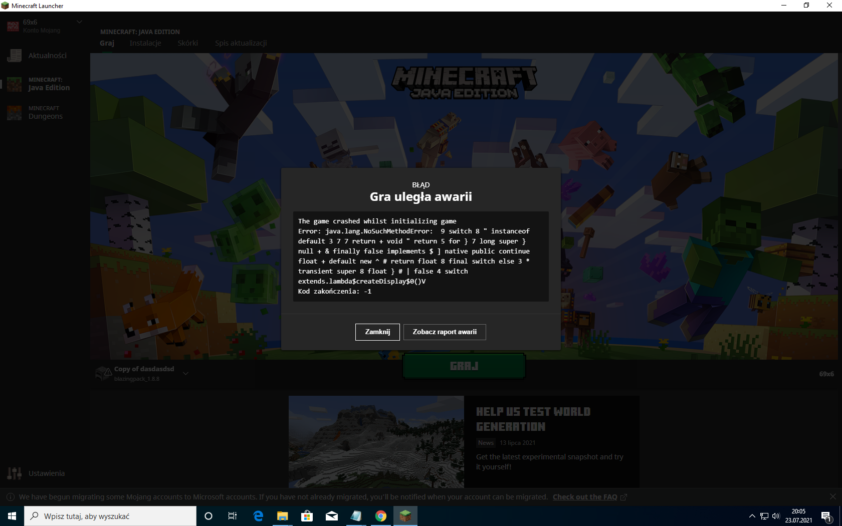 java.lang.BootstrapMethodError: java.lang.NoSuchMethodError: 9 switch 8 " instanceof default 3 7 7 return + void " return 5 for } 7 long super } null + & finally false implements $ ] native public continue float + default new ^ # return float 8 final switch else 3 * transient super 8 float } # | false 4 switch extends.lambda$createDisplay$0()V at 9 switch 8 " instanceof default 3 7 7 return + void " return 5 for } 7 long super } null + & finally false implements $ ] native public continue float + default new ^ # return float 8 final switch else 3 * transient super 8 float } # | false 4 switch extends. short 2(Unknown Source) at 9 switch 8 " instanceof default 3 7 7 return + void " return 5 for } 7 long super } null + & finally false implements $ ] native public continue float + default new ^ # return float 8 final switch else 3 * transient super 8 float } # | false 4 switch extends. = 7 continue(Unknown Source) at 9 switch 8 " instanceof default 3 7 7 return + void " return 5 for } 7 long super } null + & finally false implements $ ] native public continue float + default new ^ # return float 8 final switch else 3 * transient super 8 float } # | false 4 switch extends. 1 short(Unknown Source) at net.minecraft.client.main.Main.main(Unknown Source) at sun.reflect.NativeMethodAccessorImpl.invoke0(Native Method) at sun.reflect.NativeMethodAccessorImpl.invoke(Unknown Source) at sun.reflect.DelegatingMethodAccessorImpl.invoke(Unknown Source) at java.lang.reflect.Method.invoke(Unknown Source) at pl.blazingpack.launcher.BlazingPackLauncher.main(BlazingPackLauncher.java:27)Caused by: java.lang.NoSuchMethodError: 9 switch 8 " instanceof default 3 7 7 return + void " return 5 for } 7 long super } null + & finally false implements $ ] native public continue float + default new ^ # return float 8 final switch else 3 * transient super 8 float } # | false 4 switch extends.lambda$createDisplay$0()V at java.lang.invoke.MethodHandleNatives.resolve(Native Method) at java.lang.invoke.MemberName$Factory.resolve(Unknown Source) at java.lang.invoke.MemberName$Factory.resolveOrFail(Unknown Source) at java.lang.invoke.MethodHandles$Lookup.resolveOrFail(Unknown Source) at java.lang.invoke.MethodHandles$Lookup.linkMethodHandleConstant(Unknown Source) at java.lang.invoke.MethodHandleNatives.linkMethodHandleConstant(Unknown Source) ... 9 more