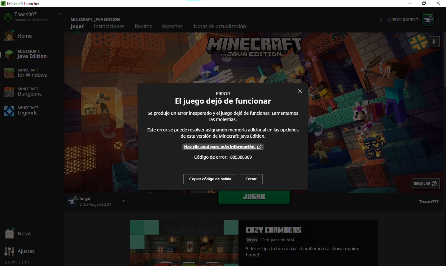 The game's been fine, but I keep getting this annoying Minecraft error: exit code -805306369.