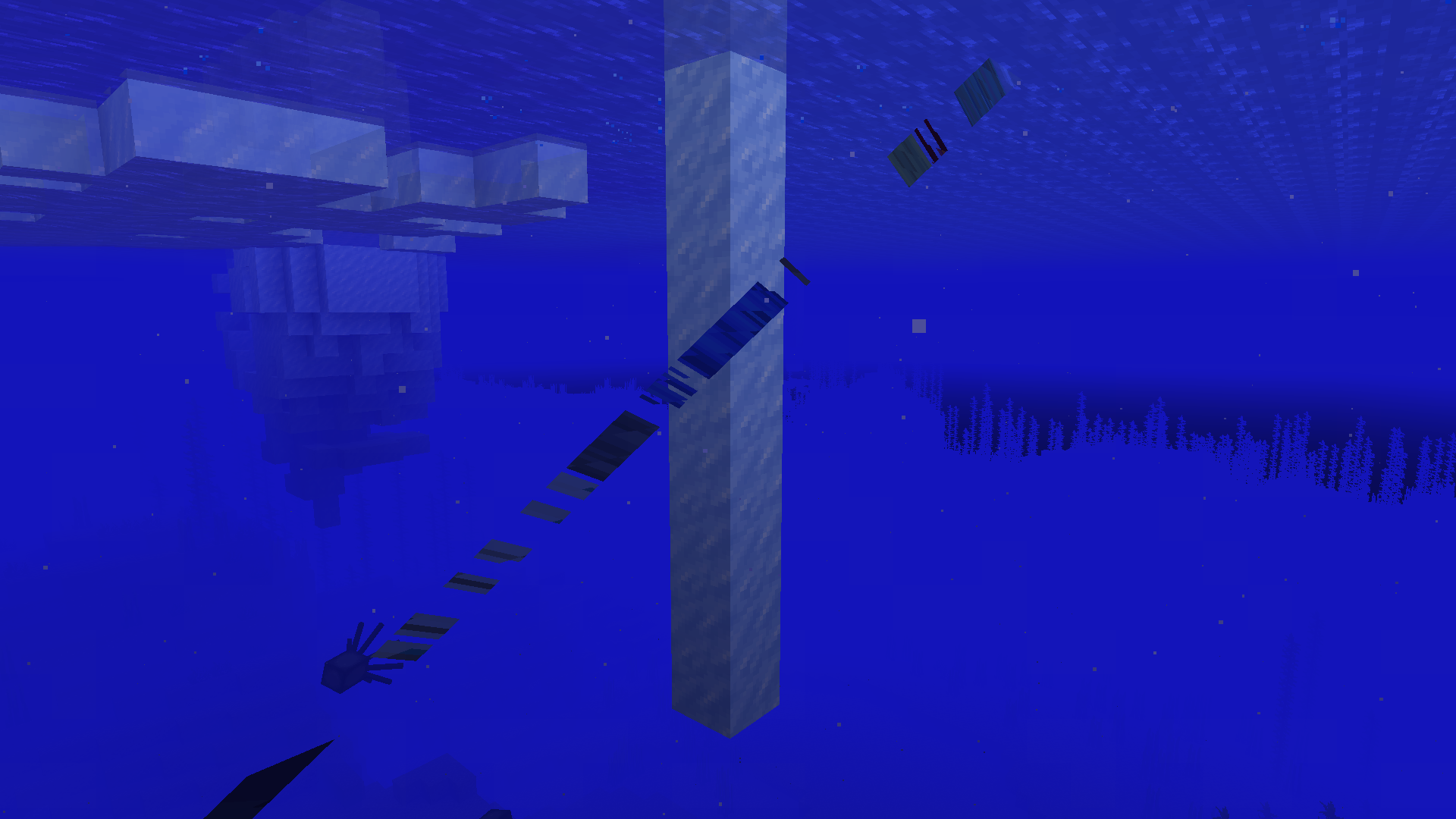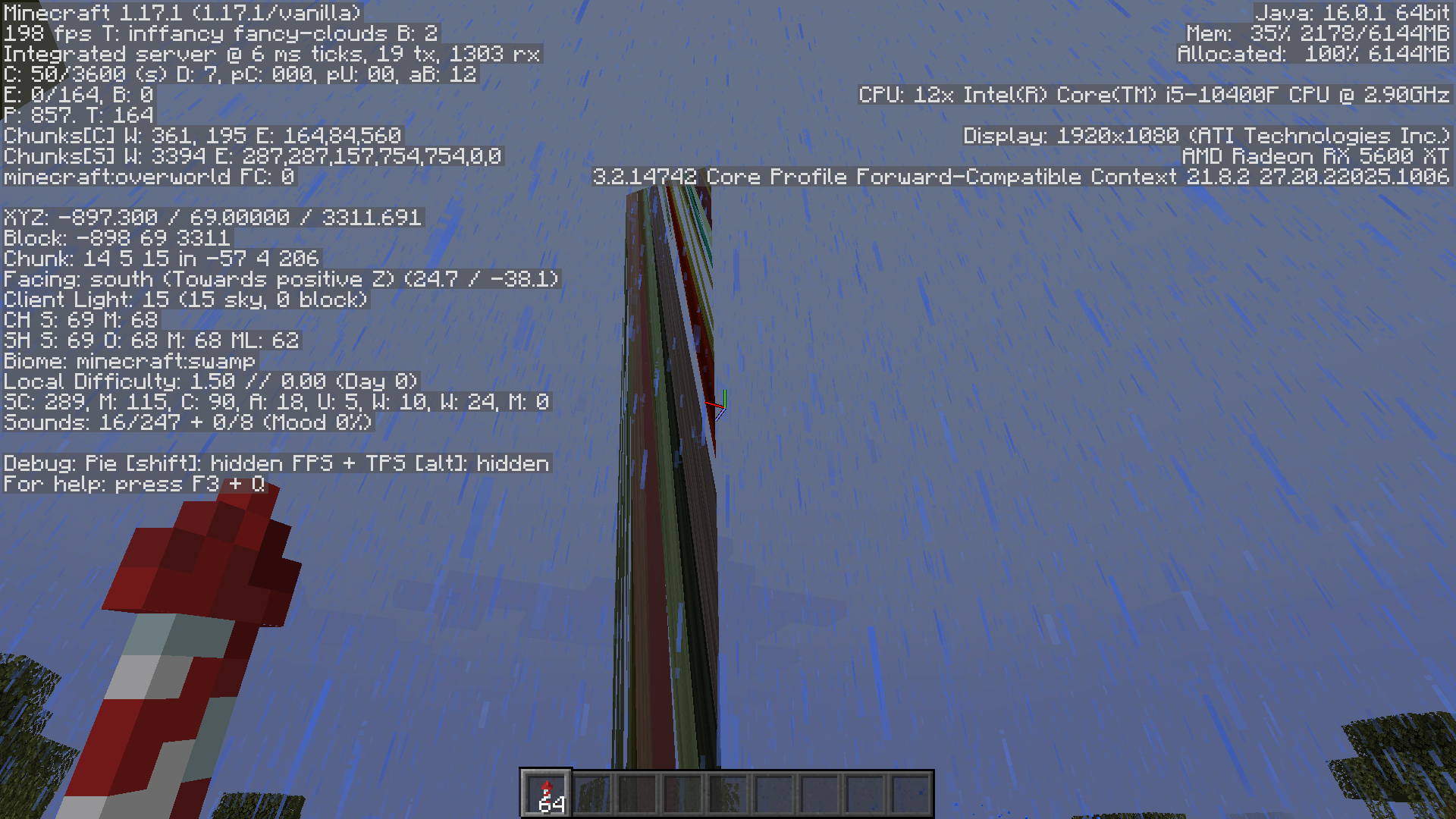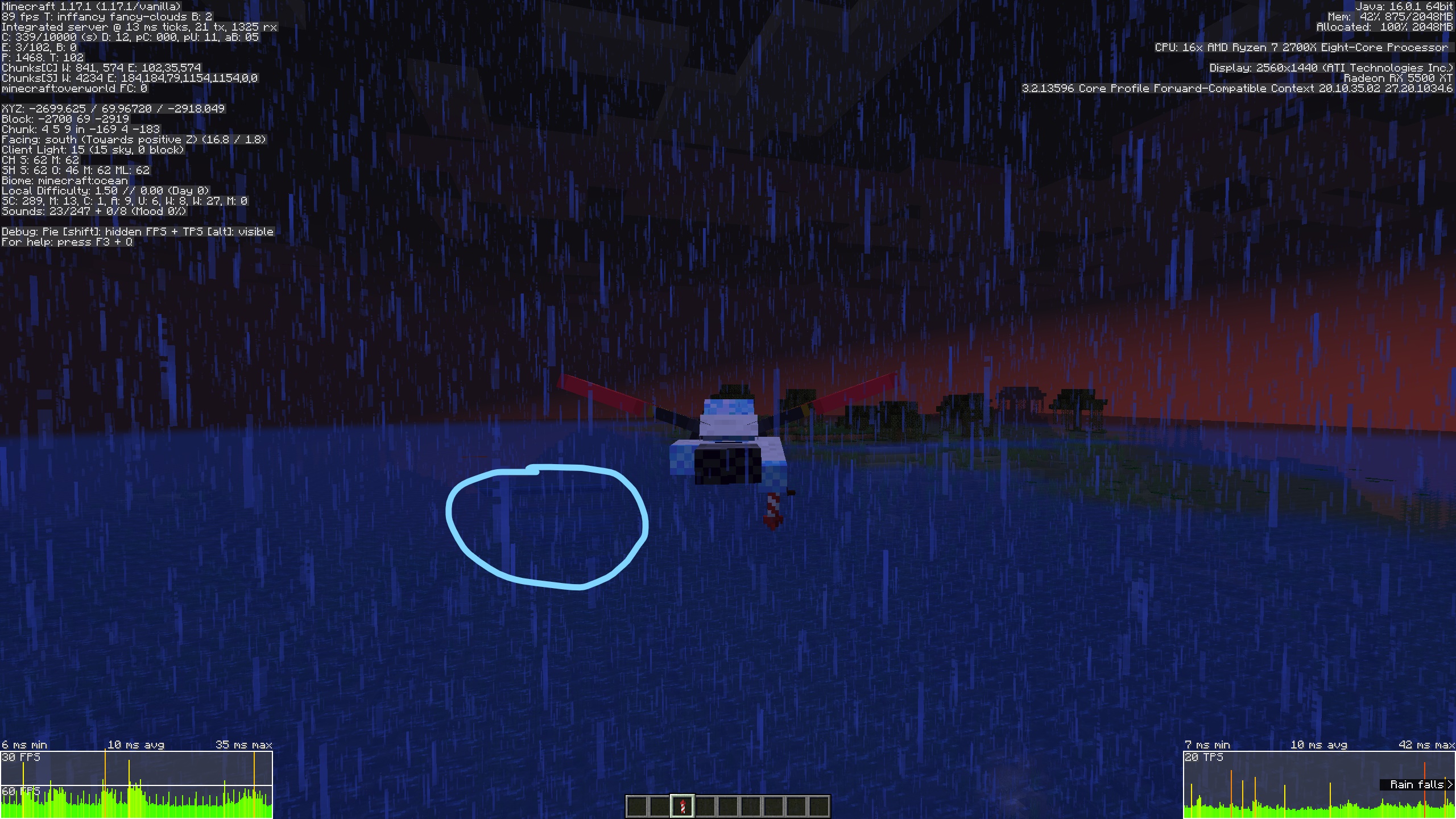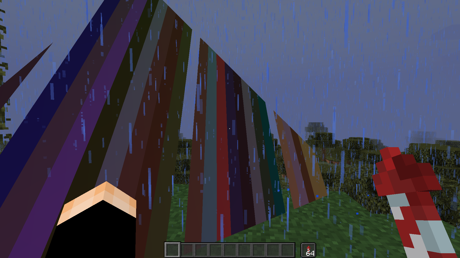 In this specific circumstance : when Clouds are set to "Fancy", during weather events (rain, snow), when over a large body of water, and when moving at high speeds (ex : Elyta + Fireworks), you'll start to notice these strange visual artifacts. All of the above criteria have to be met in order to experience this issue, otherwise your game will appear as normal. The artifacts appear and disappear at will in different parts of the world around me, and can take different shapes and colors depending on the surroundings. I've come to learn that these are called "Vertex explosions". This happens in vanilla with no resource packs applied. All screenshots were taken in vanilla, however the problem becomes infinitely more common with Optifine on.