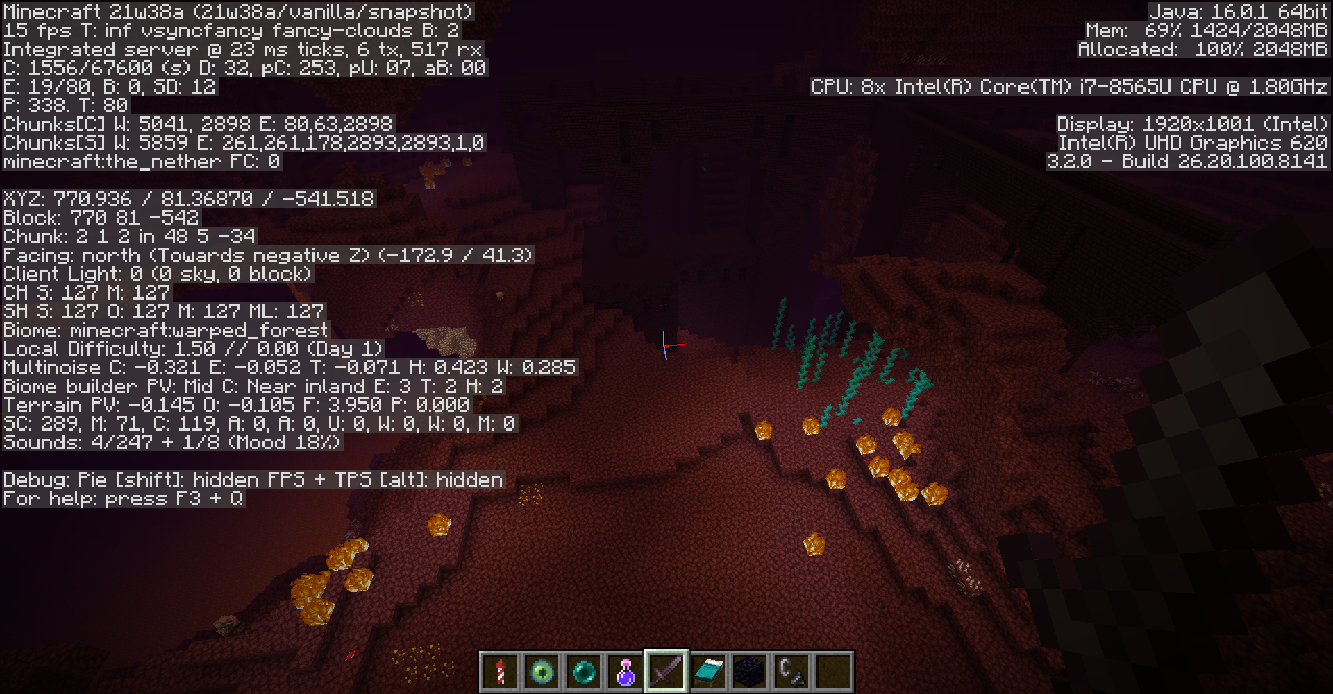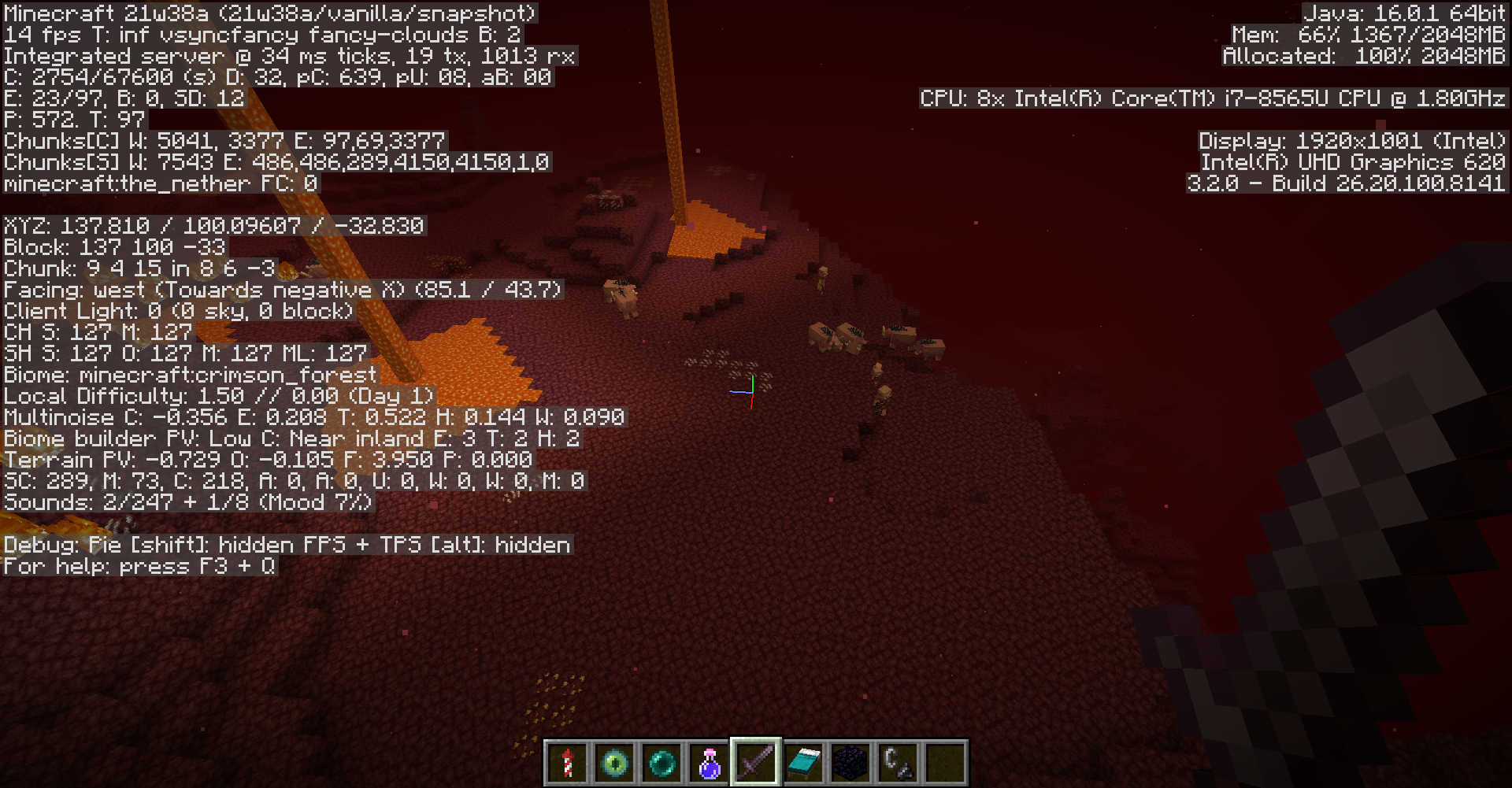 In the nether in 21w38a, the crimson forests and warped forests don't generate. All of the mobs, haze, and vines associated with the biome still spawn and generate but all of the general foliage like the nylium, shroomlight, and the "trees" don't generate at all.