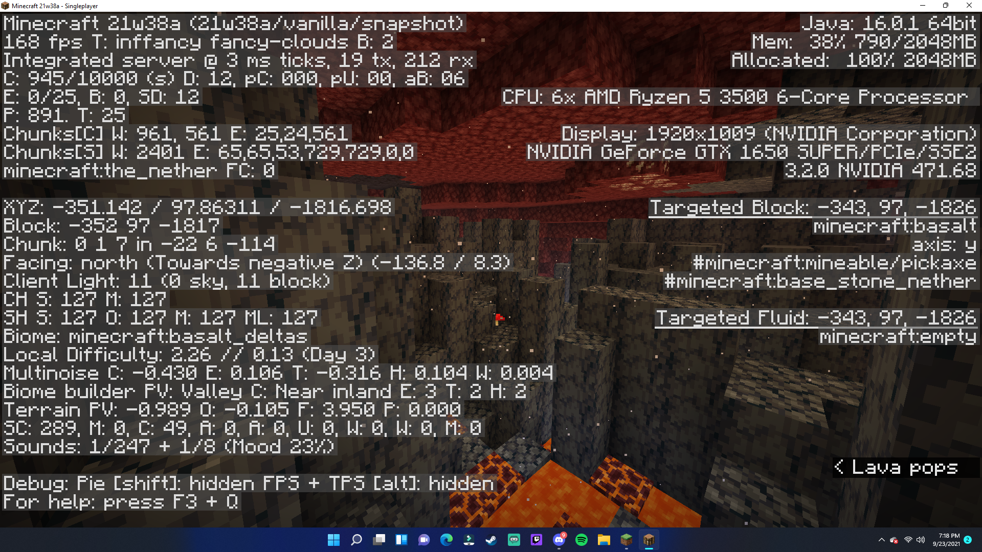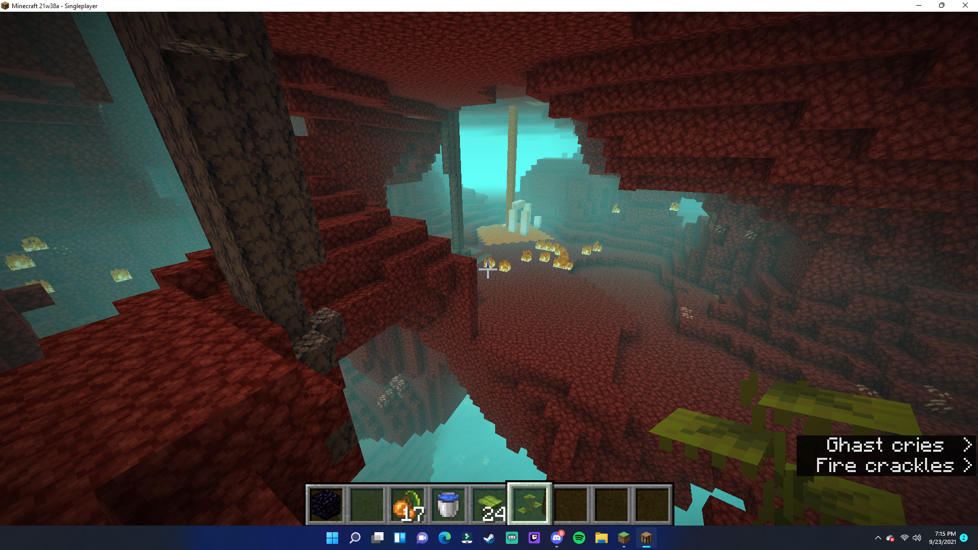 I have been messing around in the new Minecraft snapshot. I'm not entirely sure if the developers are already aware of this or not, but when I walked into the Nether to see if any generation has been unintentionally changed, there appears to have been. None of the Nether biomes (besides the Basalt Delta) has actually generated in the Nether. The Nether Fortresses and the Bastions are left untouched, but the Nether biomes have sort of been wiped away, the only things that exist withing the biomes are the twisting vines and weeping vines. (and of course the basalt pillars for the soulsand valley)