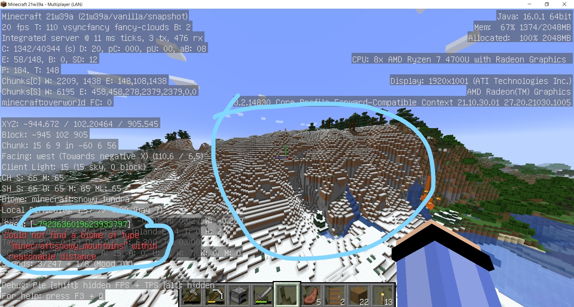 Playing in a survival world, I come across a snowy mountains biome in 21w39a, but for some reason the game doesn't think it's there and instead thinks it is a snowy tundra (which it's not). There is a snowy taiga directly bordering it at the top, but a regular snowy taiga surely doesn't generate at y=120+. This weird patch of land has the exact same traits as a Snowy Mountains, but the game says there's no nearby tall/mountain biomes at all (including Snowy Mountains).