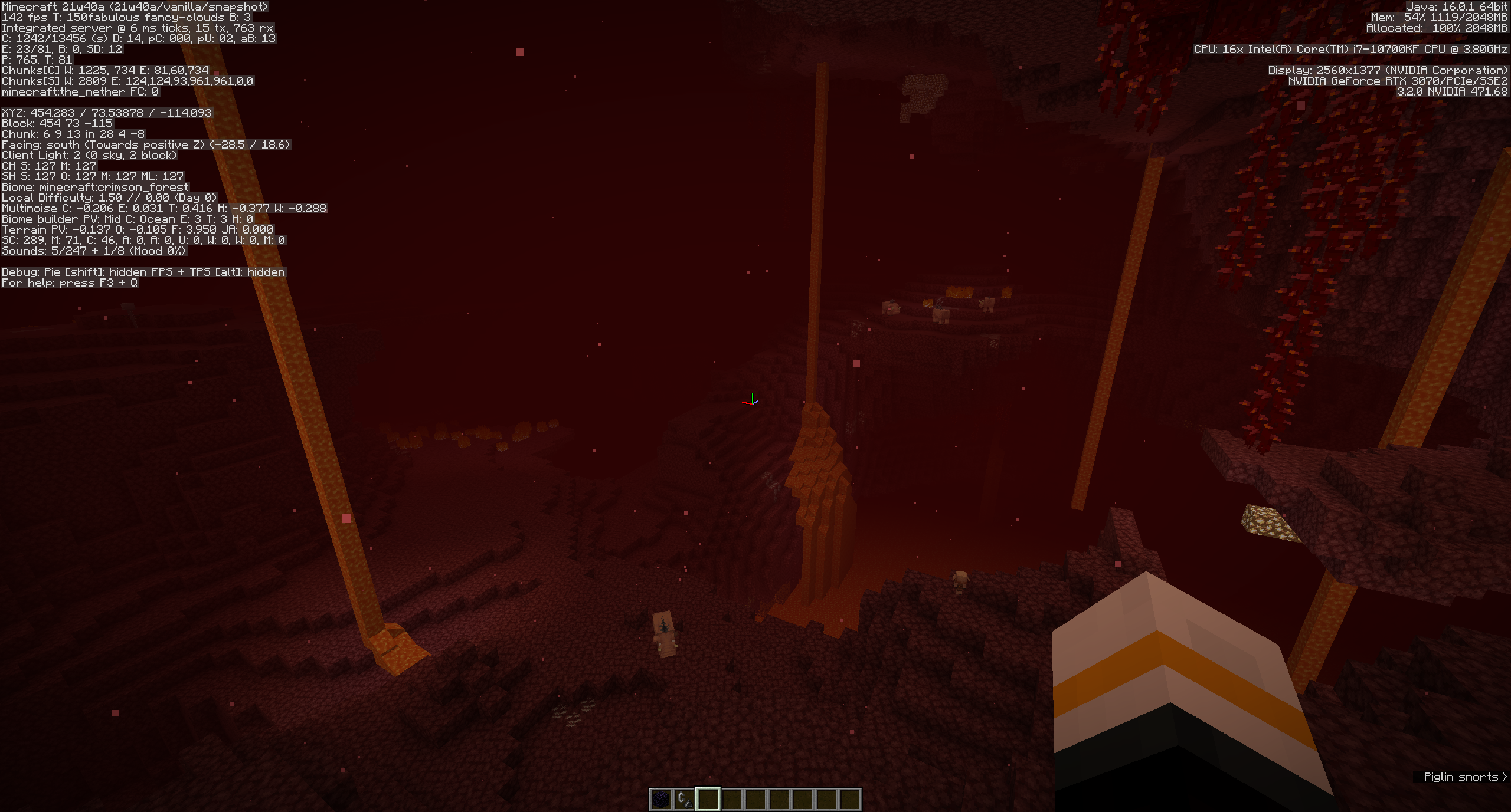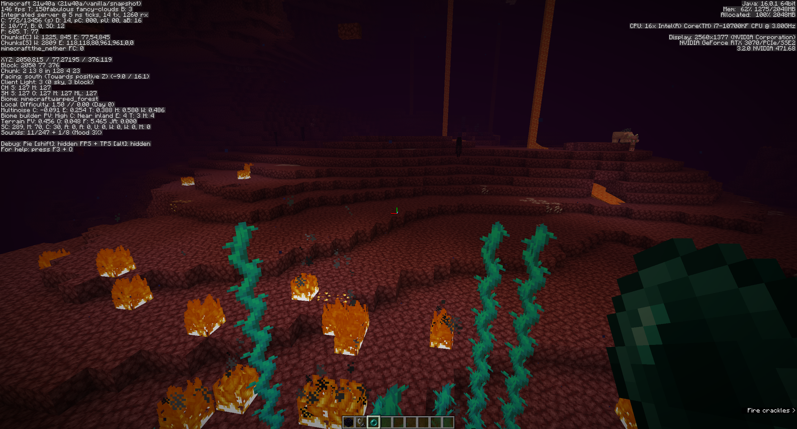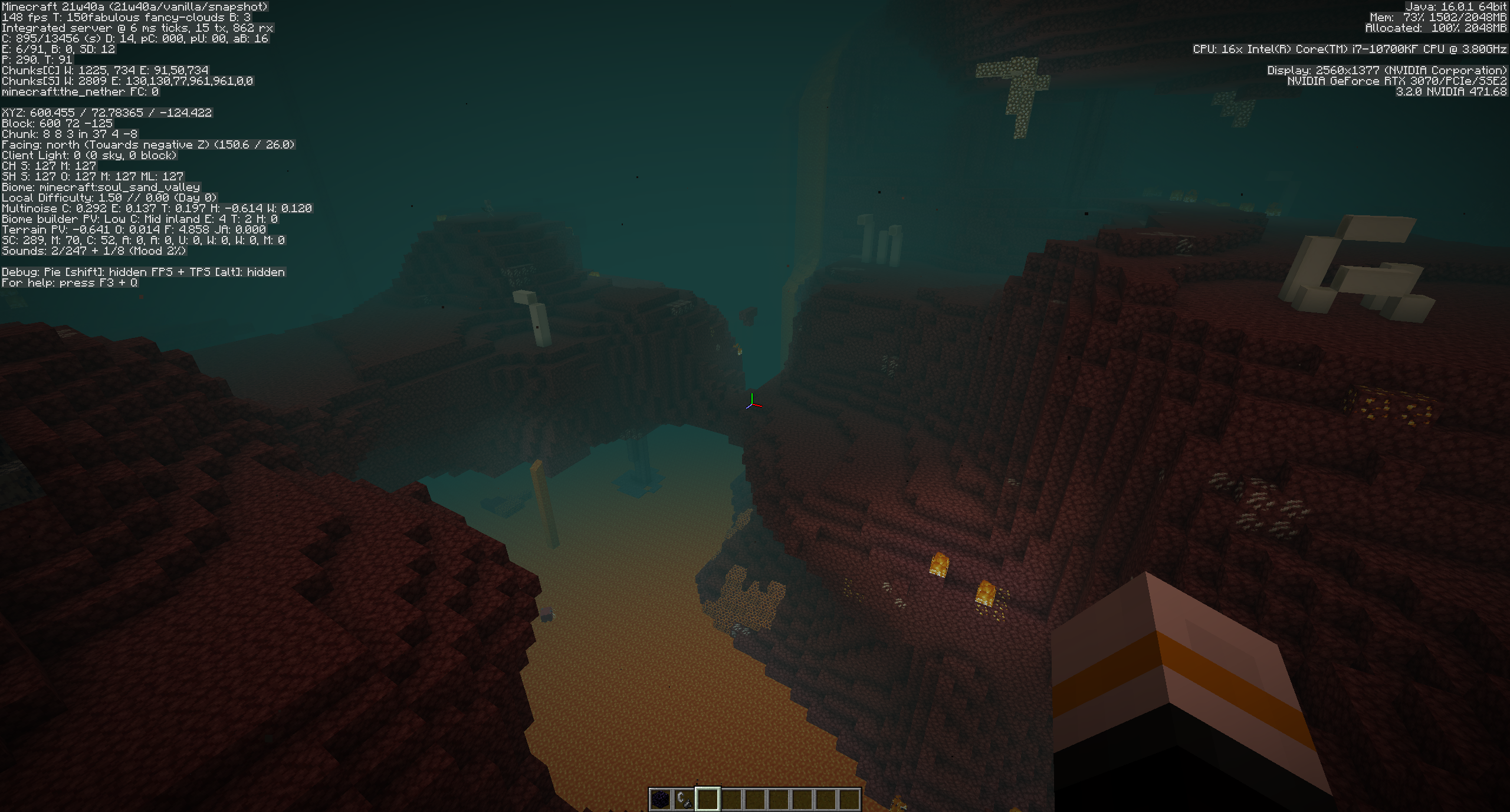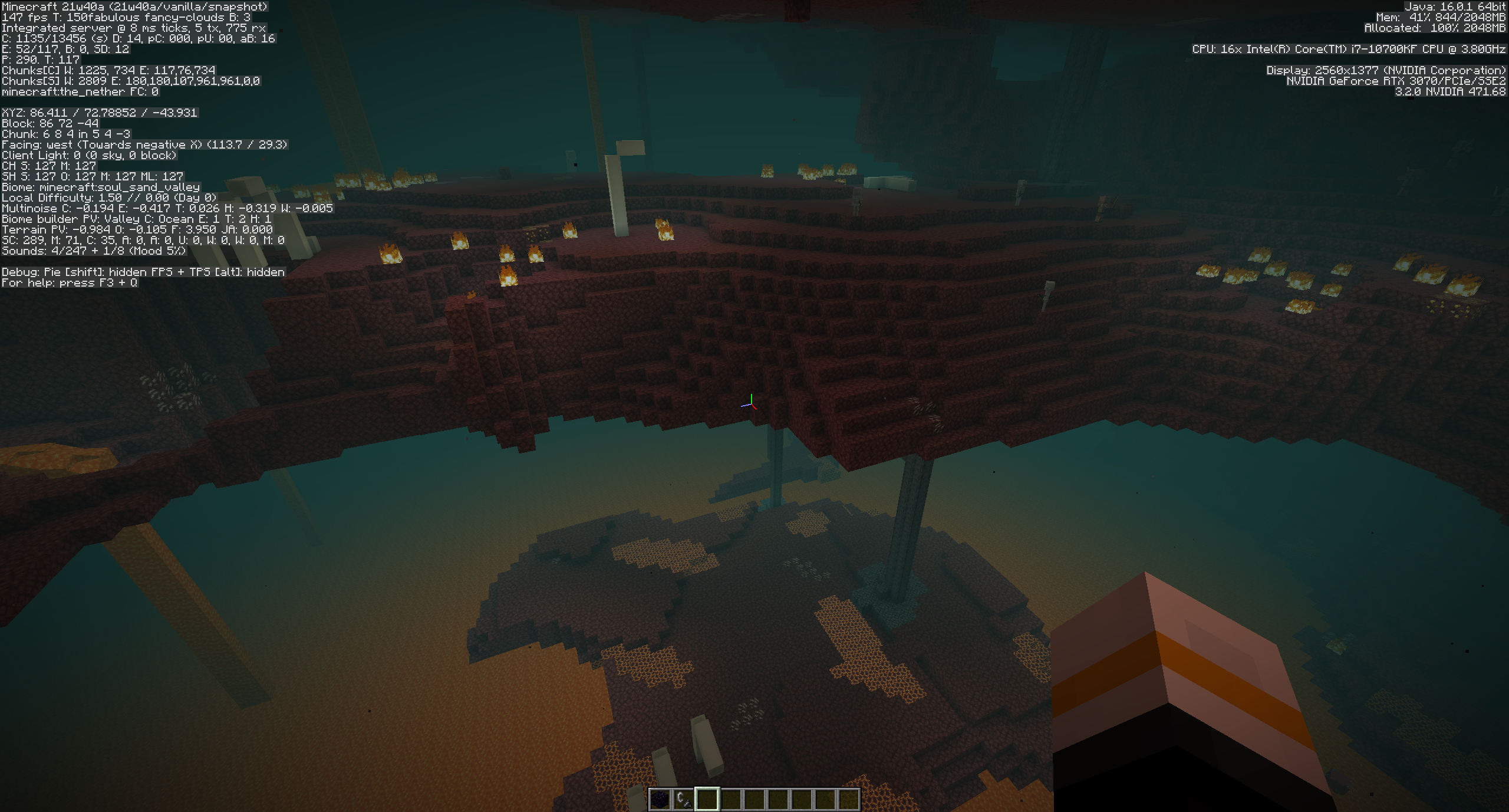 The biomes, crimson forest, warped forest, and soul sand valley are not generating properly in the nether. For example no trees will spawn in the two forest biomes and no soul sand generates in soul sand valley, they just look like normal nether wastes. They still spawn a few features, the soul sand valley will still generate bone structures, and the two forests will still generate some of the respective vines generating on the floor or ceiling. All the biomes still spawn the correct mobs: skeletons, hoglins and endermen respectively.