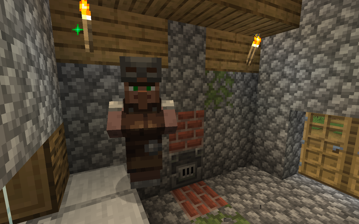 In some plains biome village, there's a house with a blast furnace inside. Usually the unemployed villager walks inside the house to reach the job block to become an armorer, but instead the villager just looks at the block and cannot transform. This is due to an cobblestone arch which covers the blast furnace and prevents the villager from reaching the job block. Even if you push the villager exactly next to the job block, the villager won't transform and keeps looking at the block. However, as soon as you break the cobblestone arch or just the single brick block on top of the blast furnace, the villager transforms.