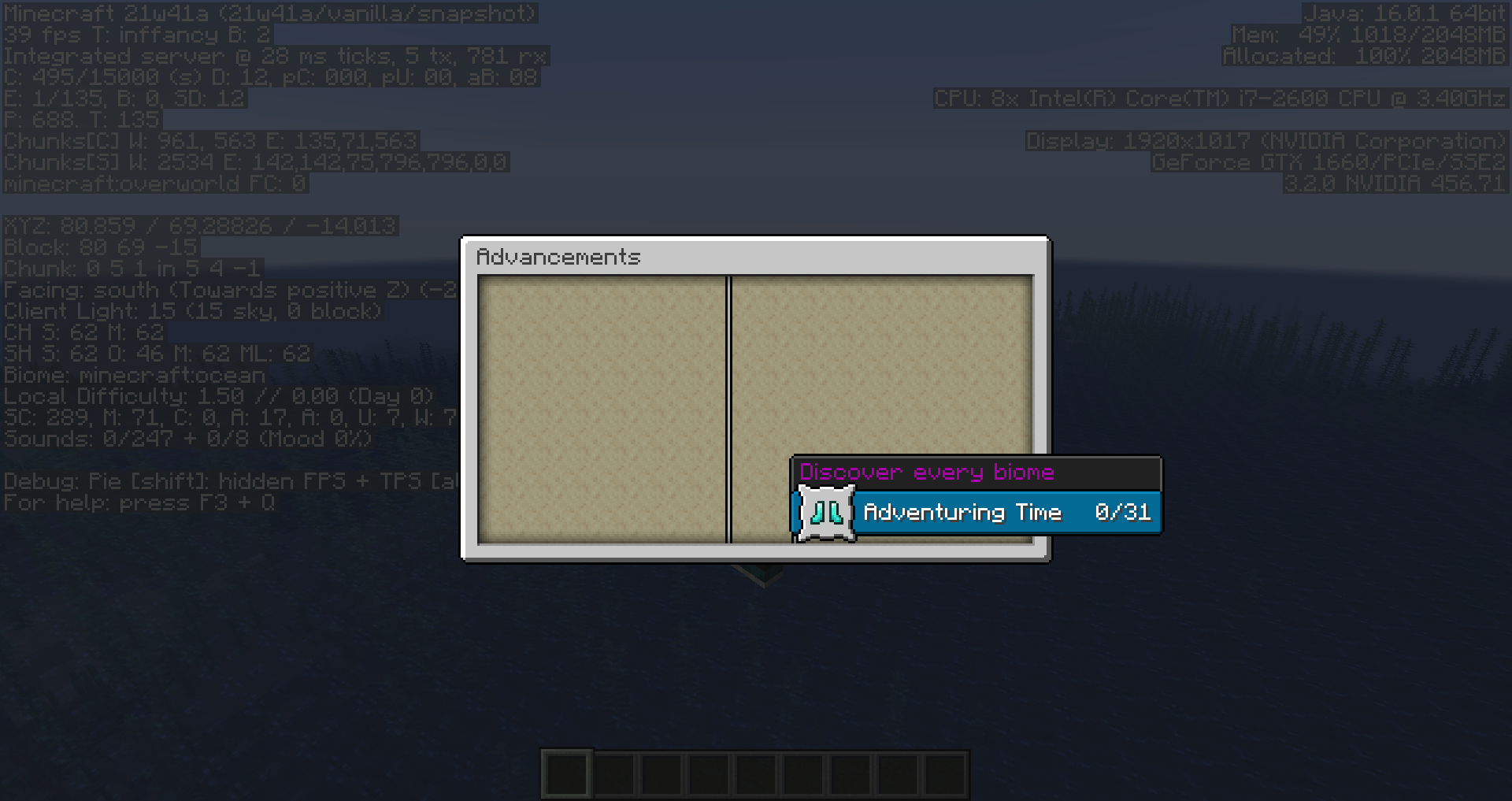 ✔ You should have one biome (your spawn biome)Do /locatebiome deep_ocean or /locatebiome ocean