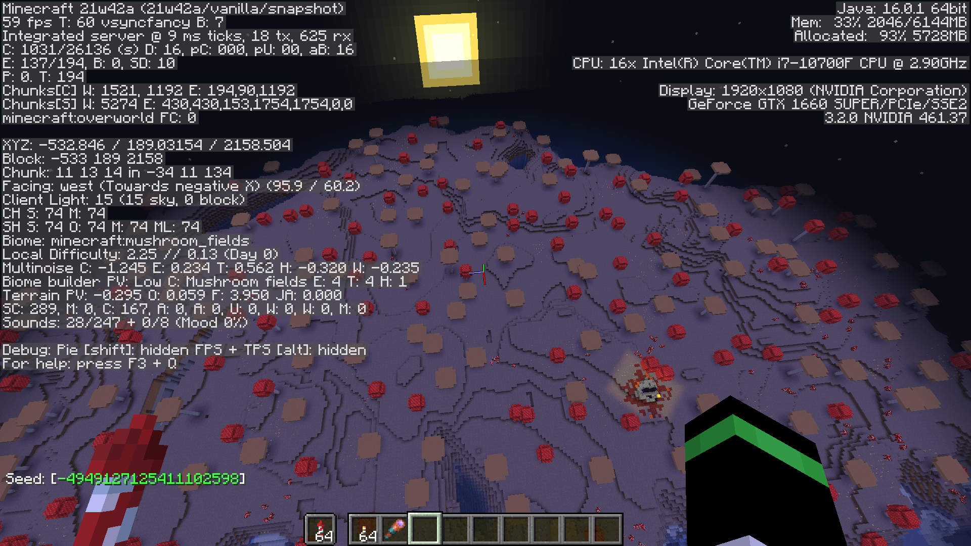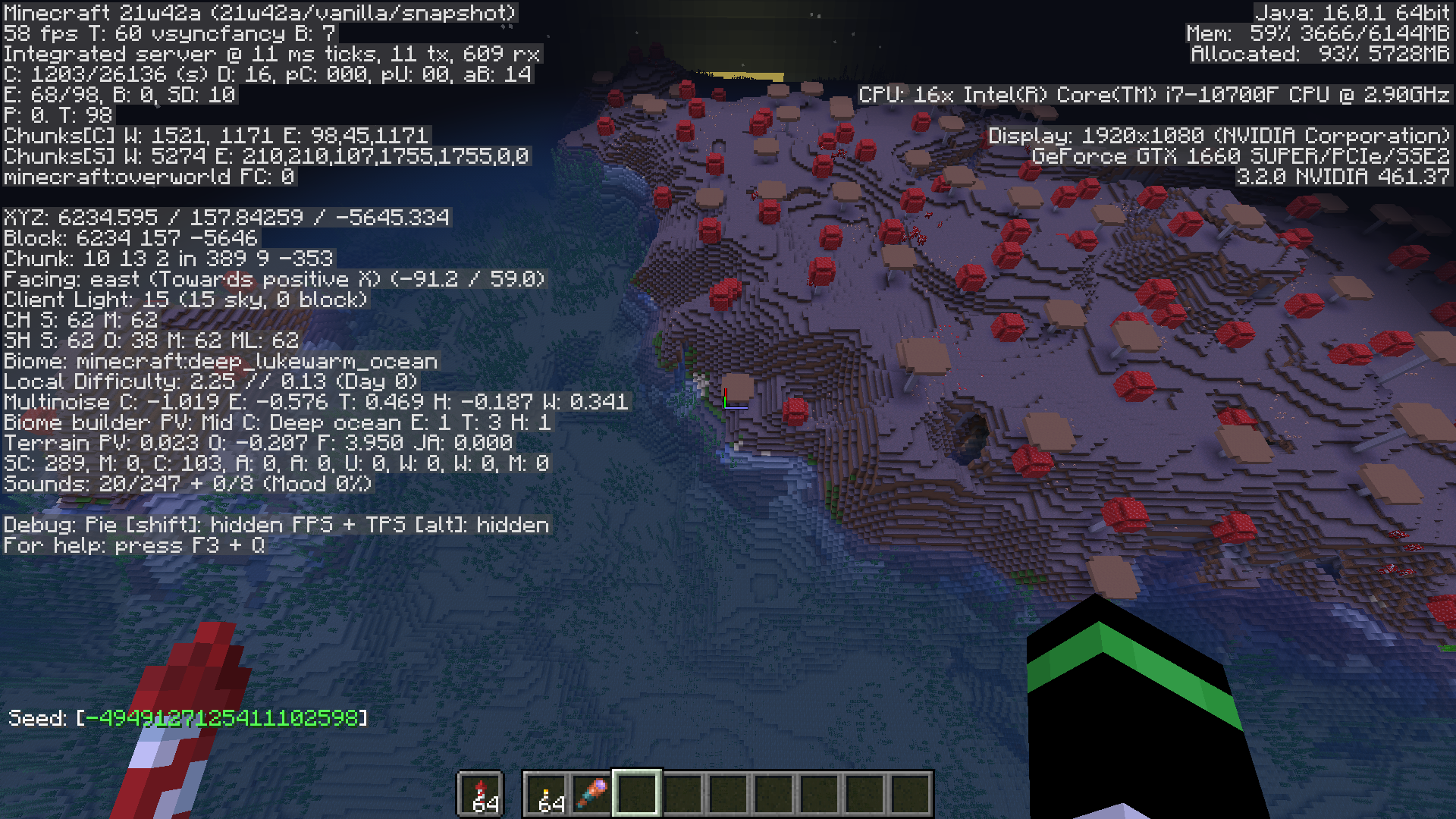 Mushroom islands sometimes do not generate any terrain above water, as shown in the screenshot that doesn't appear to have a mushroom island pictured. However, it shows up as the mushroom_fields biome in the color of the water and debug screen.