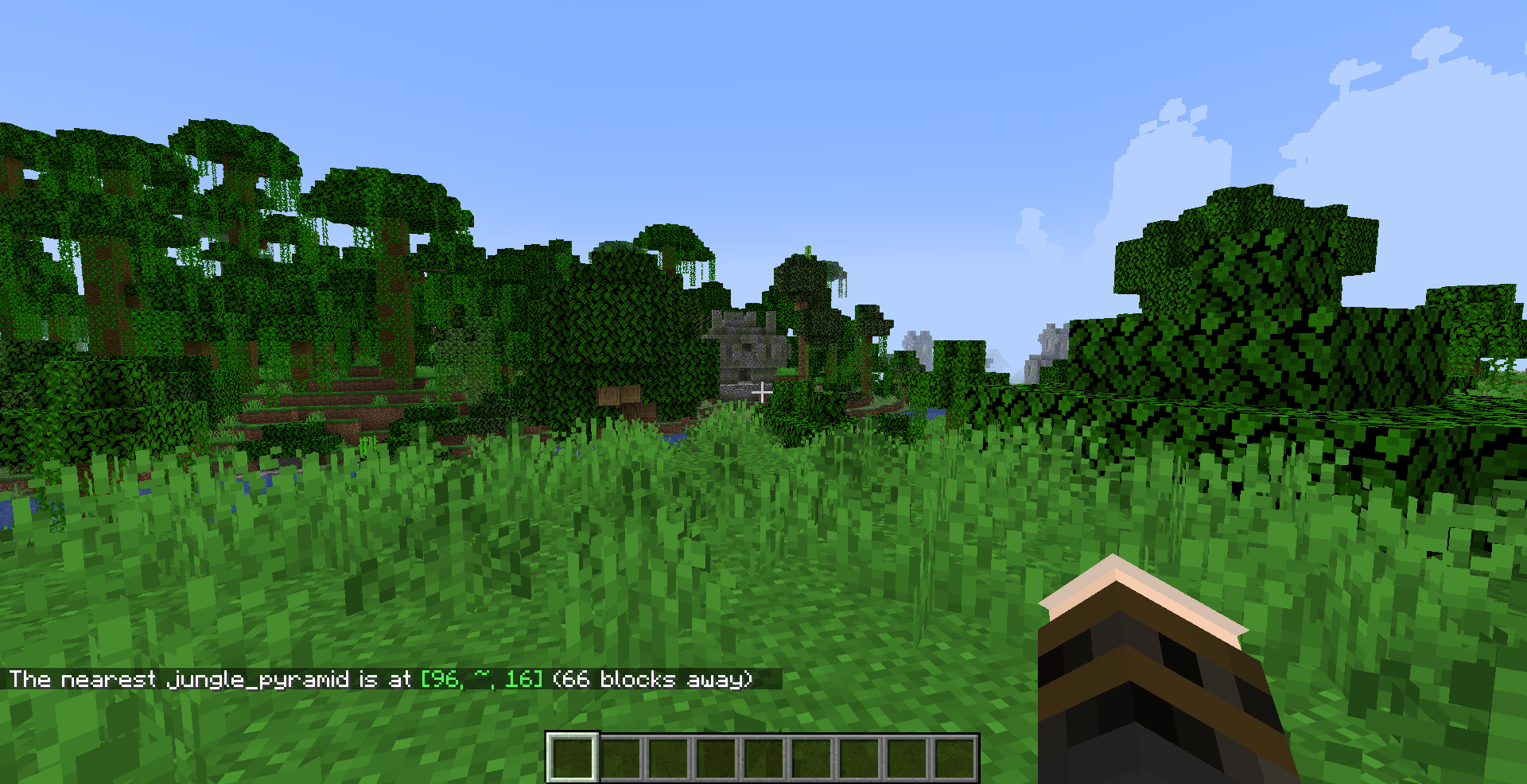 2. Move more than 80-100 blocks to the Northwest of the Jungle Temple and run /locate jungle_pyramid (It should give you the location of one a few hundred blocks away.)