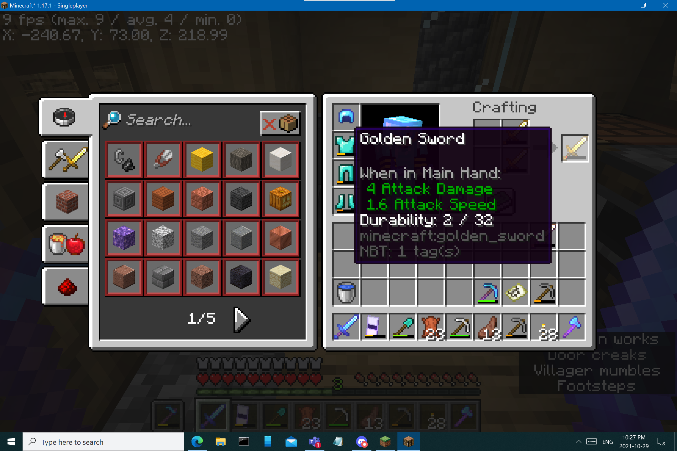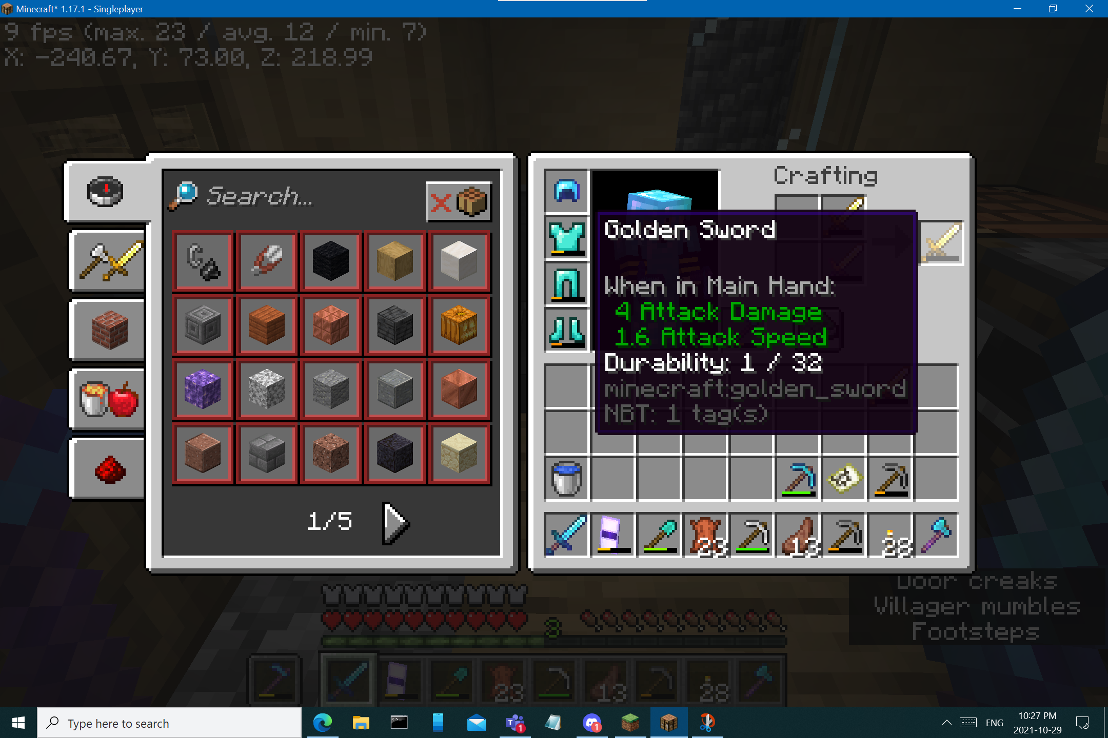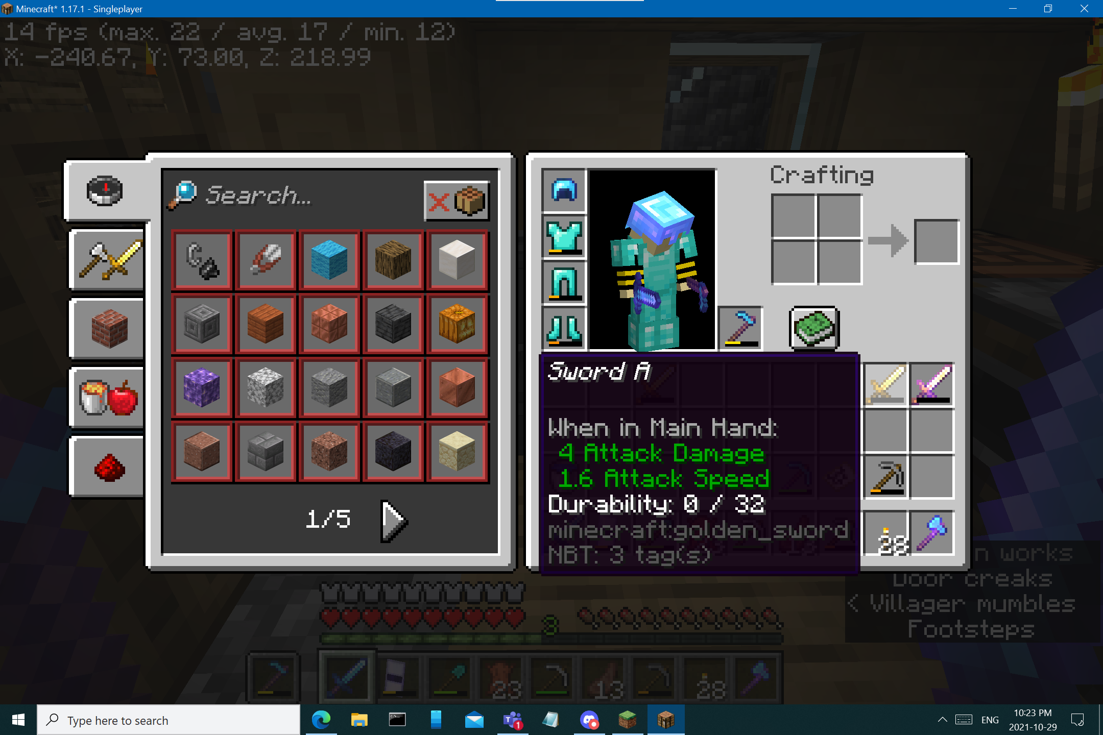 In-game, while killing zombified piglins (used Looting 3, Sharpness 4, Unbreaking 3, Mending 1, Knockback 2 sword), 3 golden swords were dropped. One is enchanted with sharp 2 (swordB), the two others are not enchanted (swordA and swordC). swordA and swordB both have durabilities 0/32 (shown in screenshots "swordA"&"swordB"), which is not correct since the tool breaks at 0 durability. swordC had durability 1/32 (screenshot "swordC"). I renamed the swords from "Golden Sword" to the corresponding names on an anvil, and proceeded to experiment.