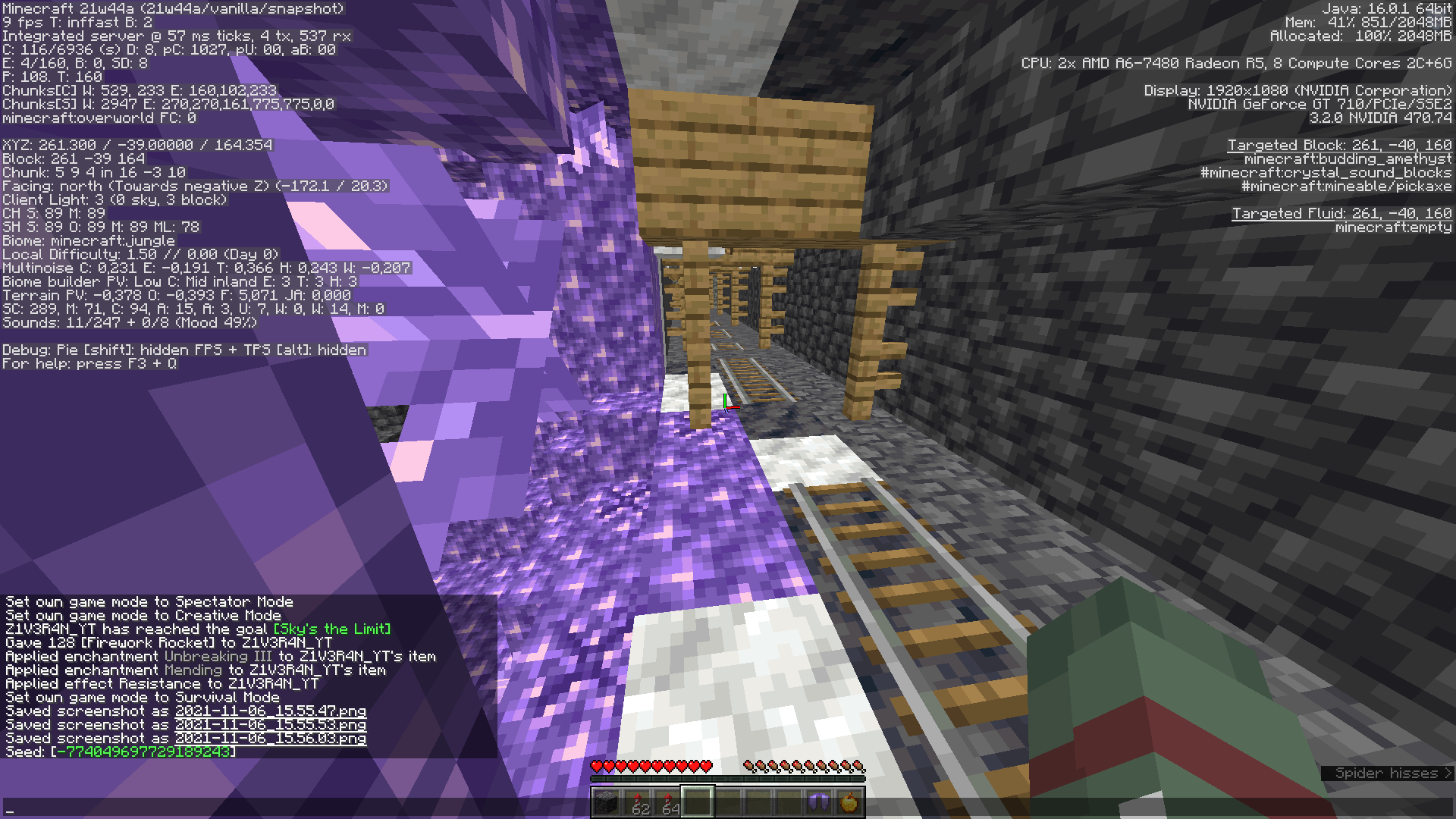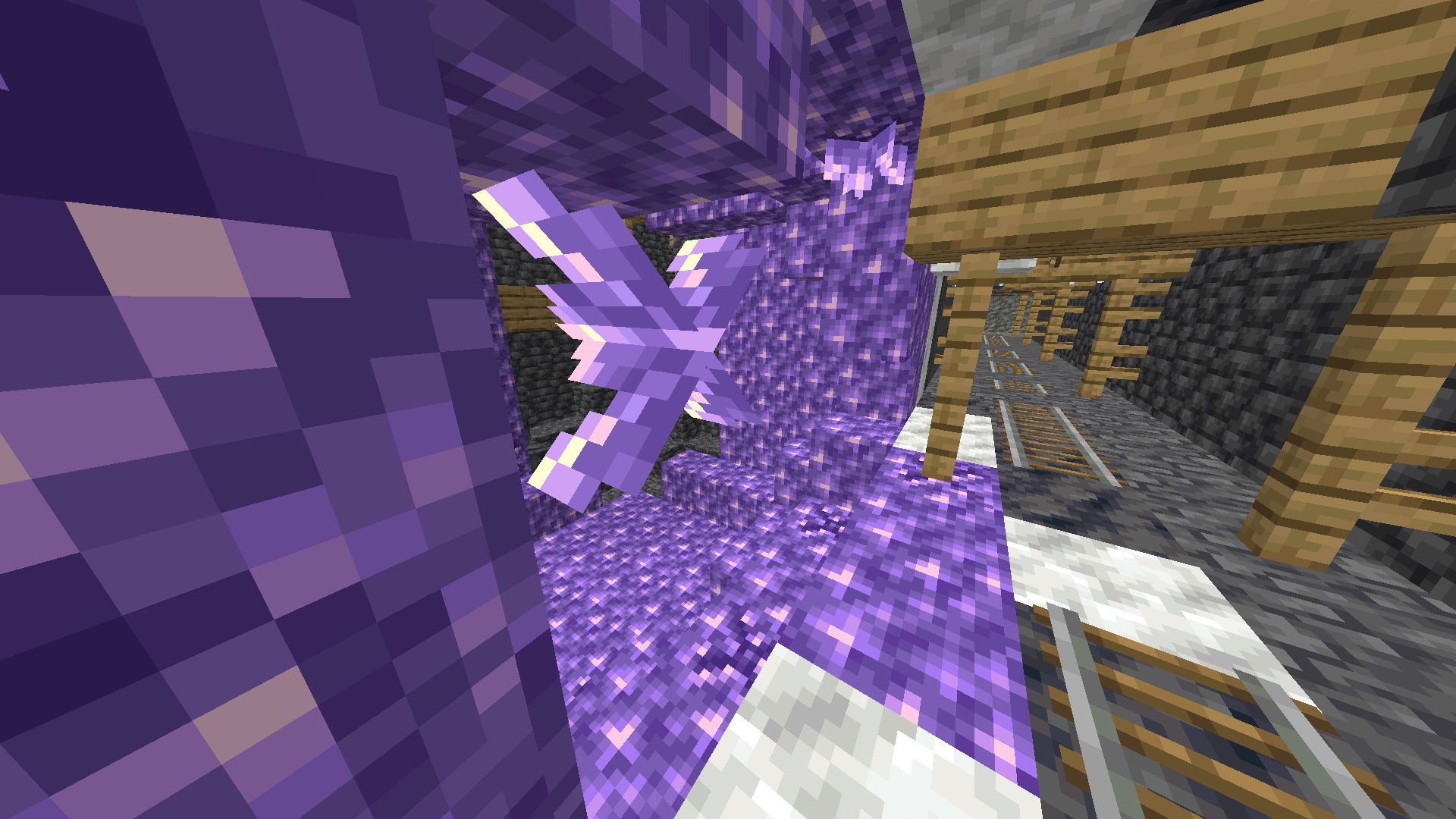 I was testing the last snapshot (21w44a) looking for caves and just try to enjoy the snapshot for a bit and I went to explore a Mineshaft when I noticed a Floating Amethyst, I thought it may be just a render bug but then I saw it was really a generation glitch, here are some screenshots.