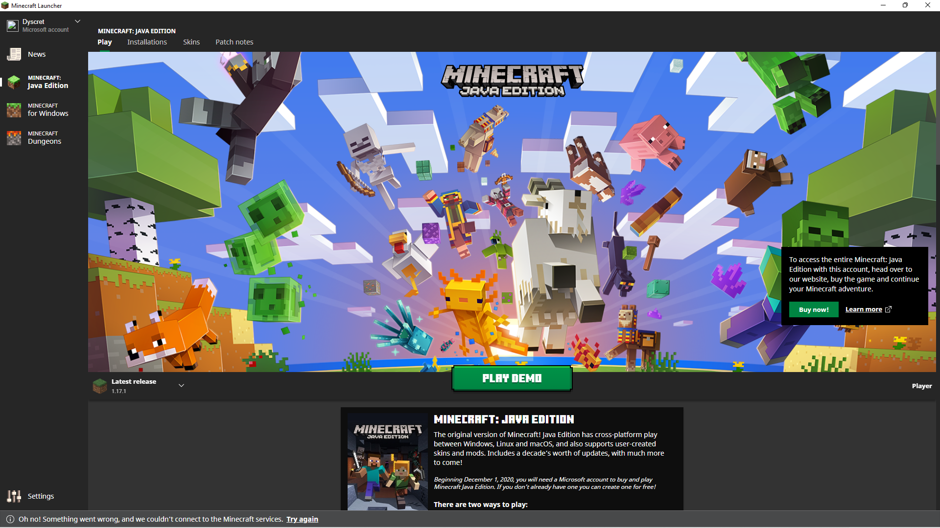 Started the launcher, logged in, and ever since it's been unable to connect to Minecraft Services. I'm now only able to play the Demo for a game I spent money on.