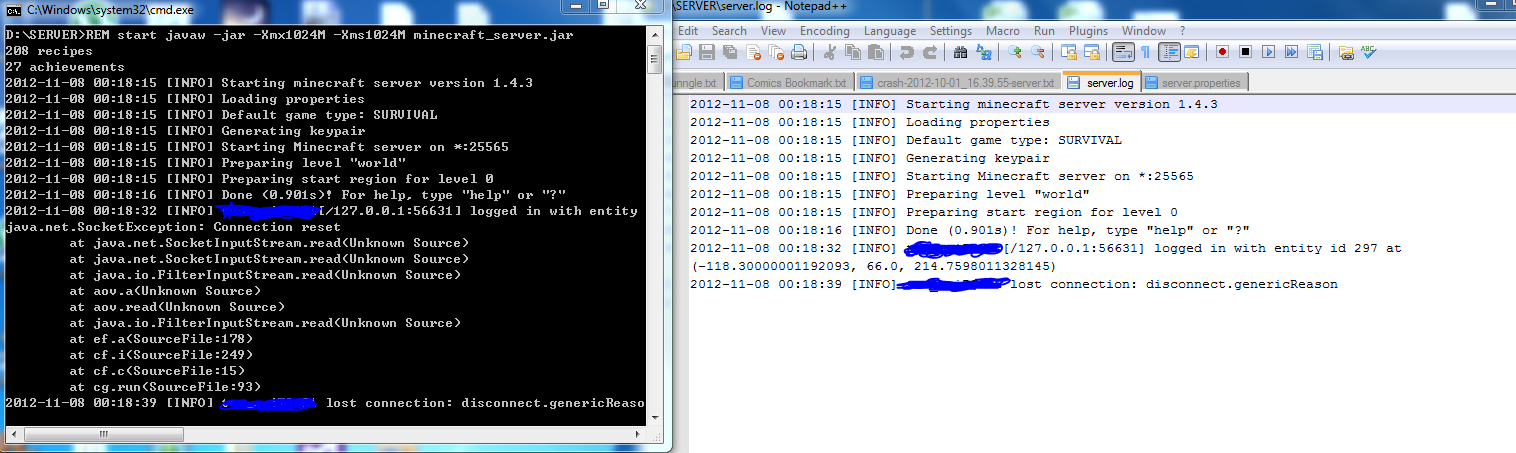 What I see at the moment: I would usually get tons and tons of SocketExceptions and a few "disconnect.genericReason" messages along with player messages and chit-chat. Actually, the SocketExceptions took up more space in the console than the individual player messages seen.