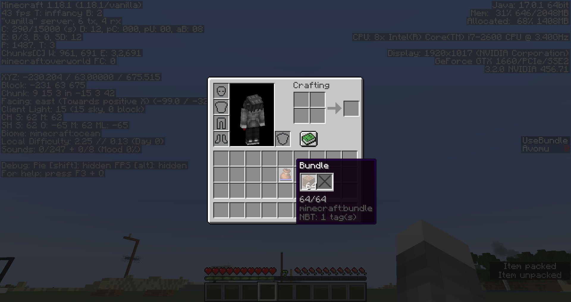 /give @s minecraft:bundle/give @s minecraft:bundle/give @s minecraft:dirt 64/give @s minecraft:dirt 64Pack and unpack items (within the inventory) several times using the bundle.