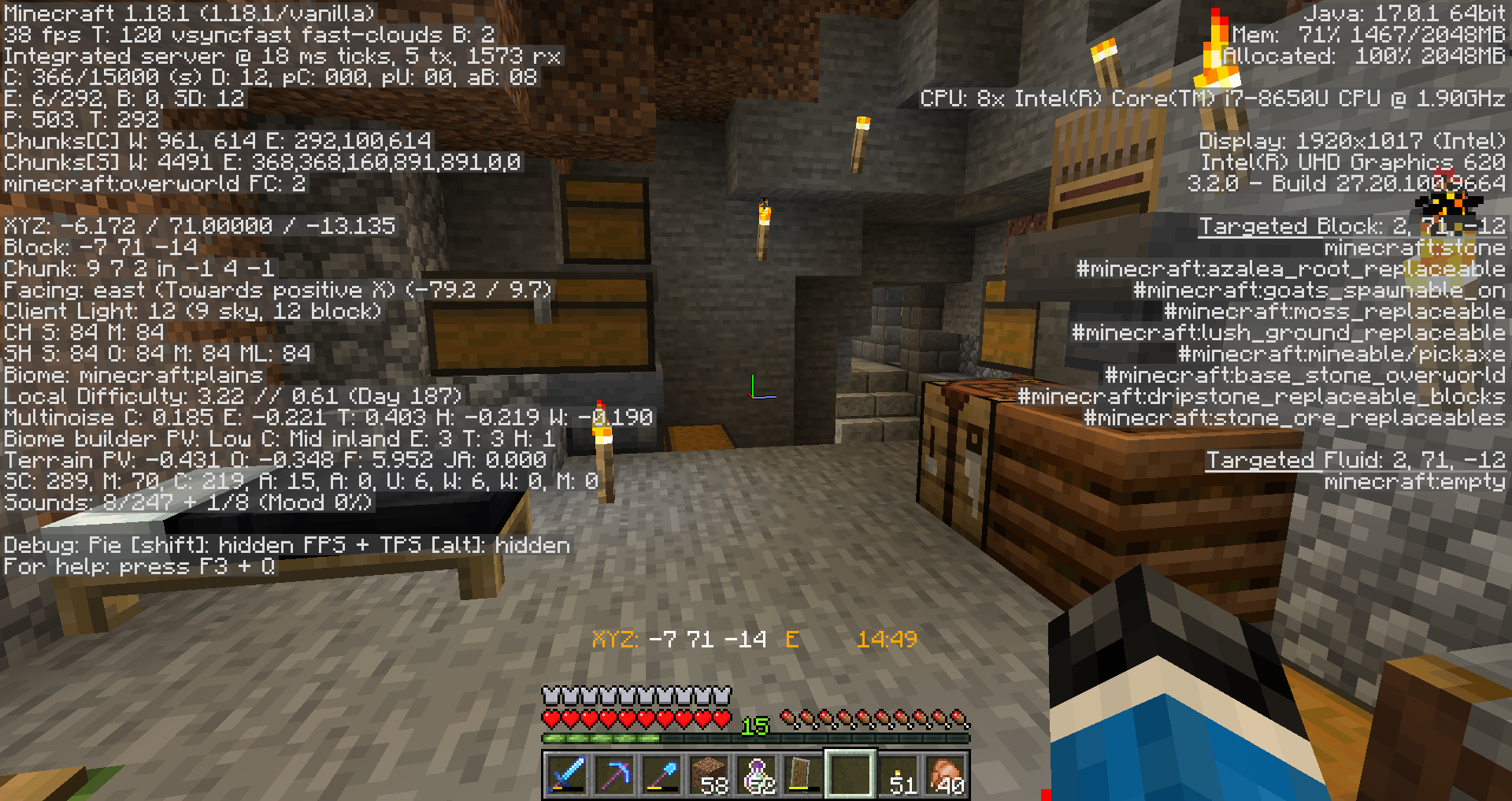 7. Right click to place a block, open a container, open/close a door, etc.