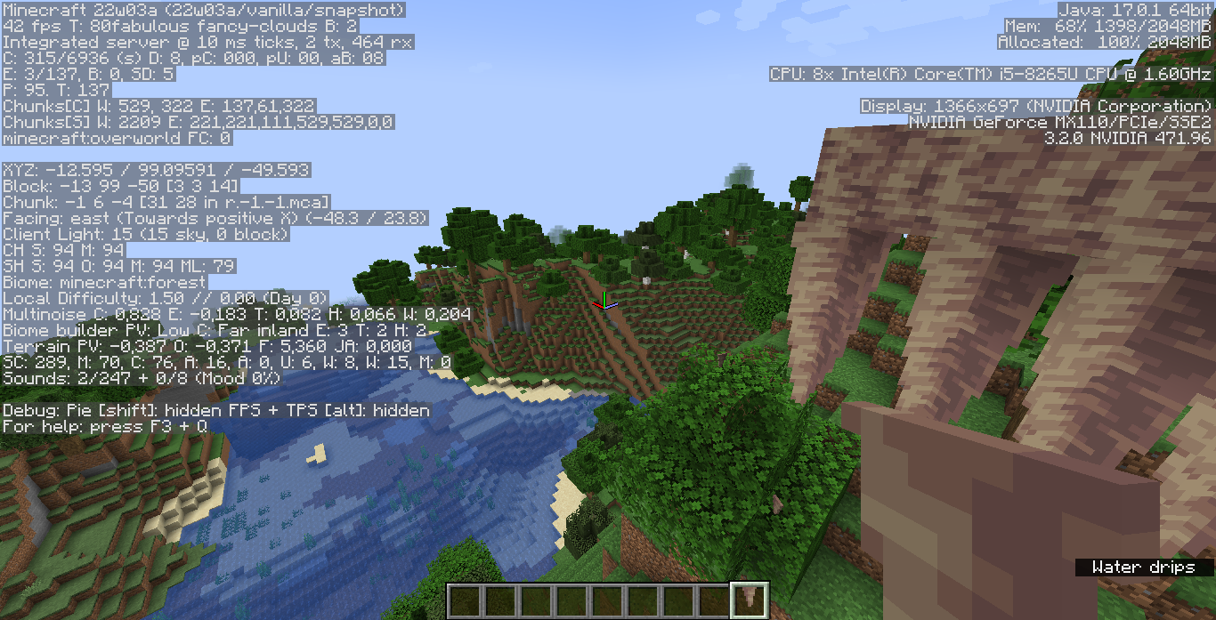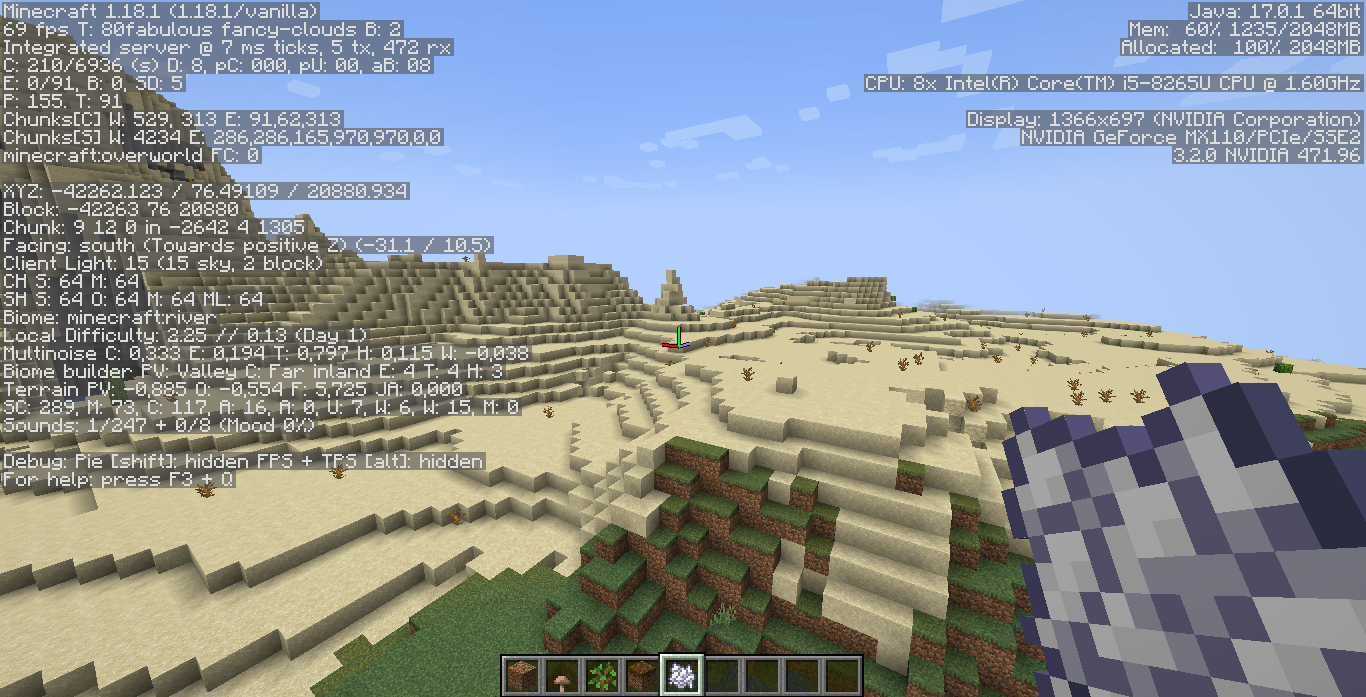 Block and Chunk information in F3 debug screen shows differently than in previous versions. For example, the Chunk information shows the MCA file name, e.g. [in r.-1.-1.mca].