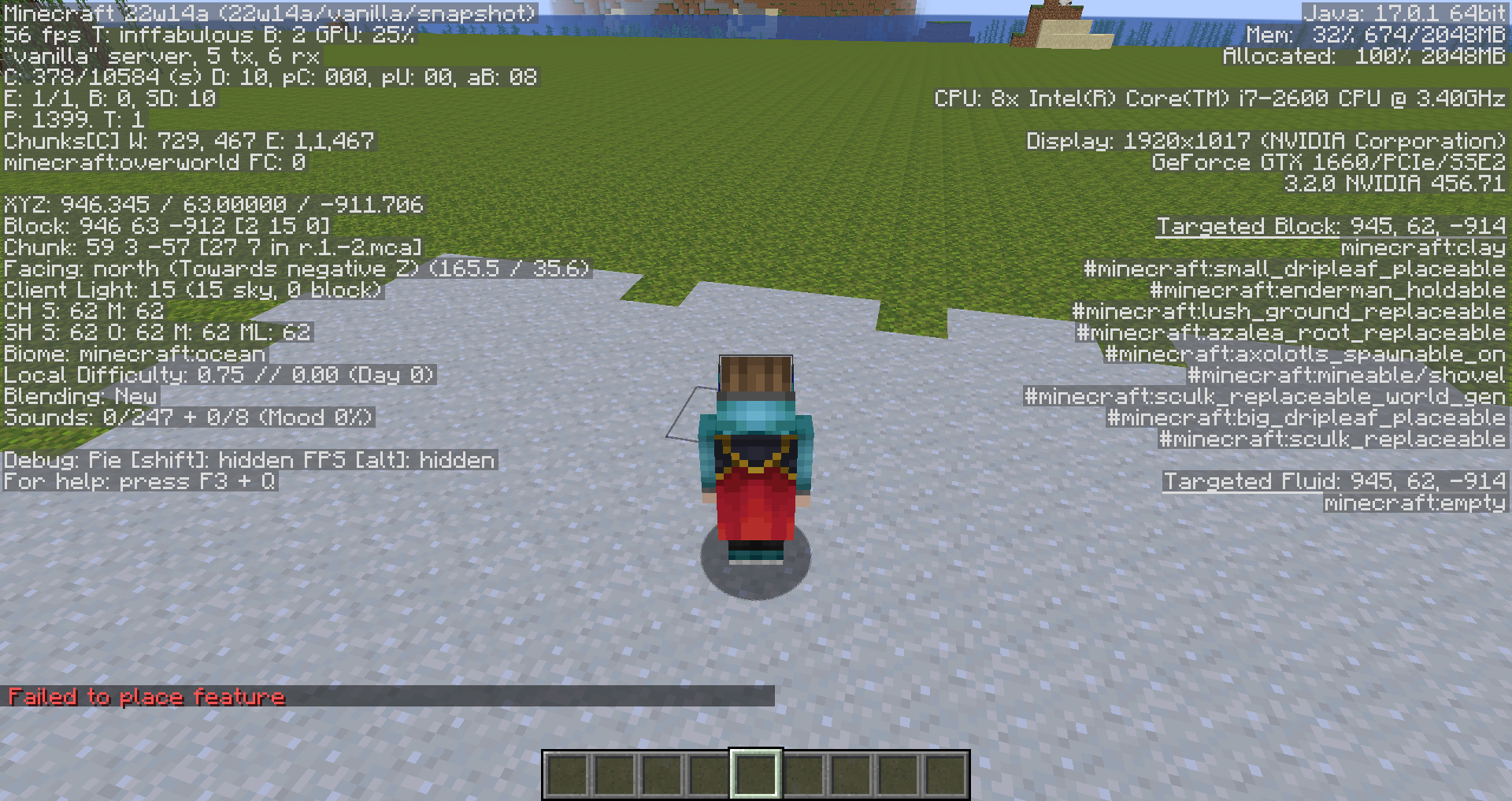 /place feature minecraft:clay_pool_with_dripleaves/place feature minecraft:clay_pool_with_dripleavesAs we see on the two following screen shot taken before and after the execution of the command, some clay has been placed on the coasts.