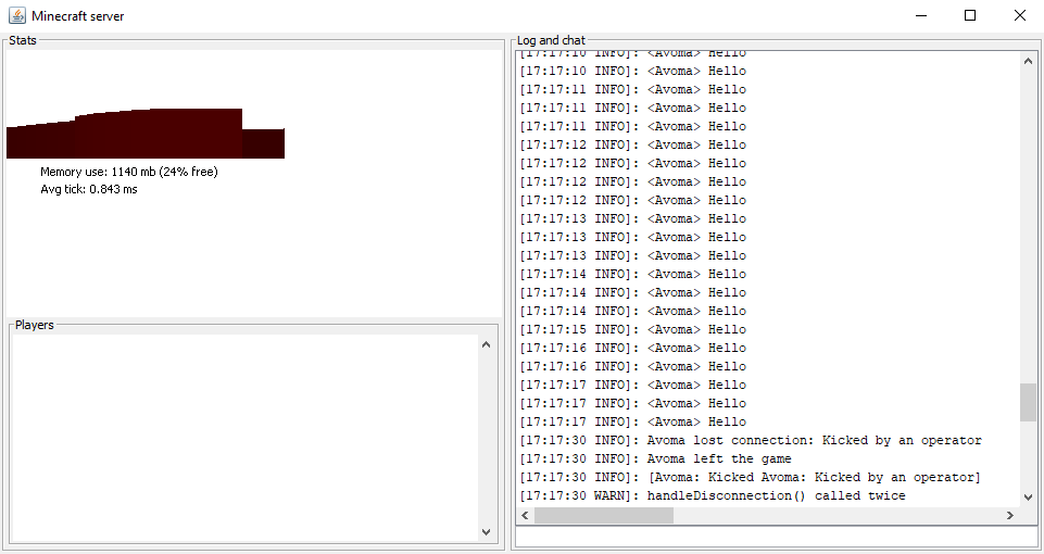 [17:17:30 WARN]: handleDisconnection() called twice[17:17:17 INFO]: <Avoma> Hello