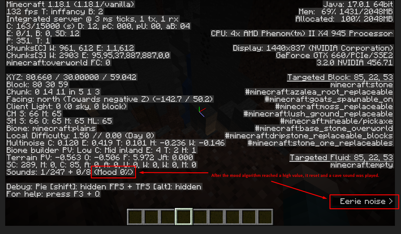The mood algorithm (the algorithm responsible for controlling how and when cave sounds are played) appeared to be functioning correctly and no issue was apparent in my testing.