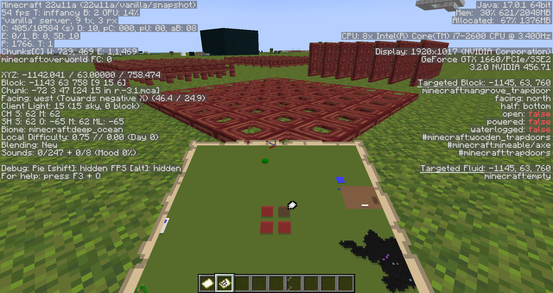 The map color for mangrove trapdoors is incorrect. It appears brown like dark oak wood, instead of the expected red. This behavior is inconsistent with other wood types, which match the color of their trapdoors to the color of their other blocks.