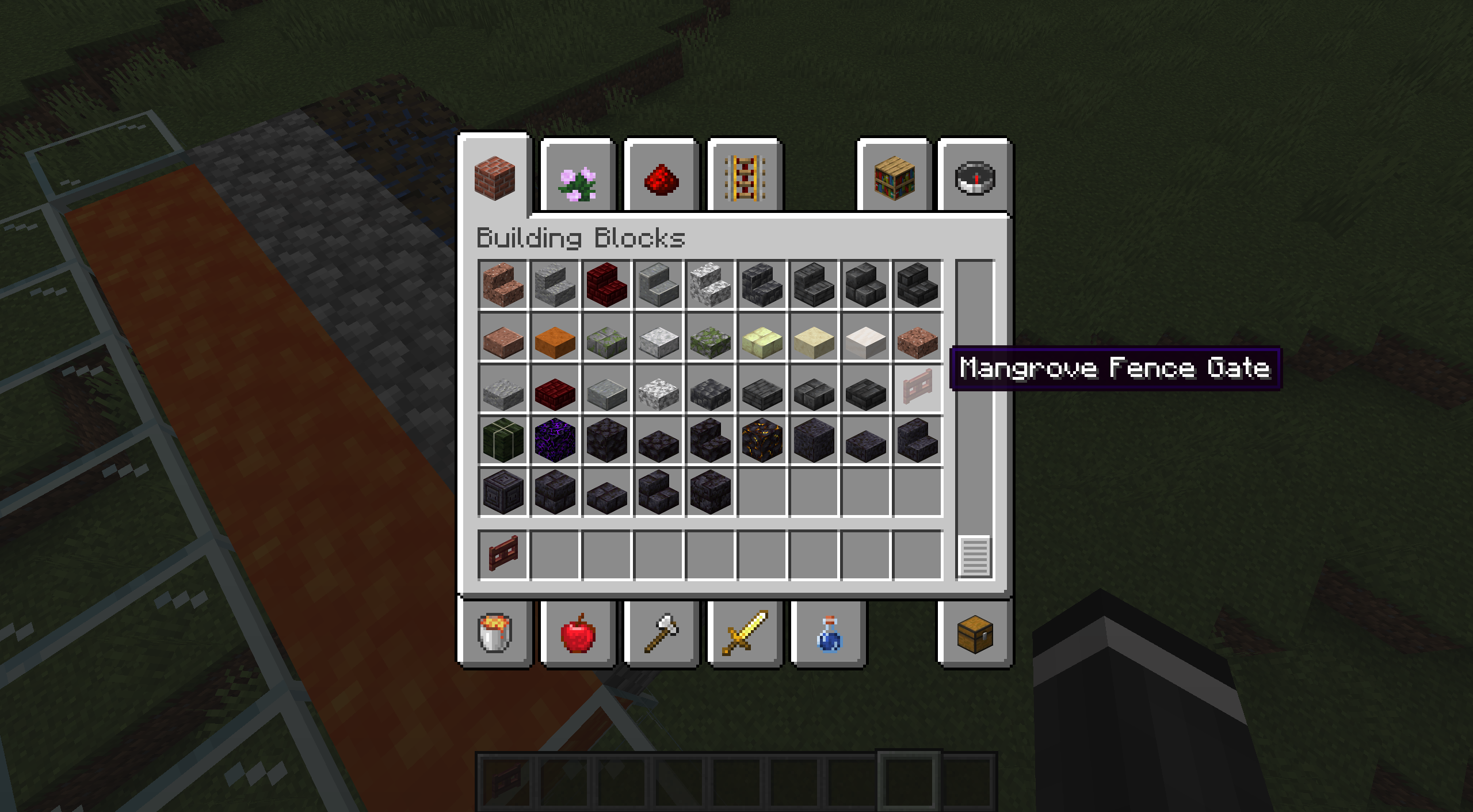 The Mangrove Fence Gate is located in the "Building Blocks"-Creative Tab, when it should be under "Redstone" just like all other wood types.