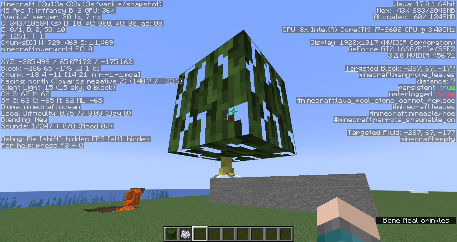 Bone mealing mangrove leaves spawns growth particles at the center of the block instead of below it.