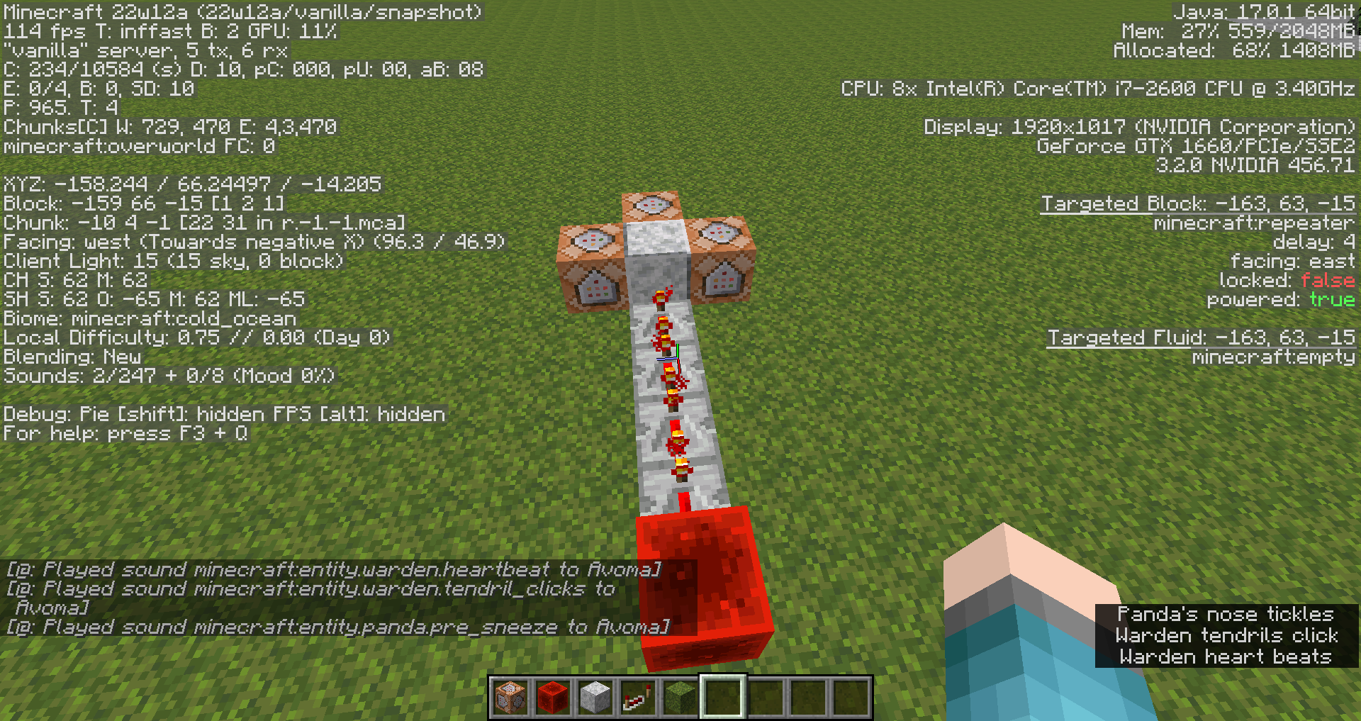 /playsound minecraft:entity.warden.heartbeat master @a/playsound minecraft:entity.warden.heartbeat master @a/playsound minecraft:entity.warden.tendril_clicks master @a/playsound minecraft:entity.warden.tendril_clicks master @aWatch the subtitles overlay closely and pay attention to how the subtitles are formatted/presented.