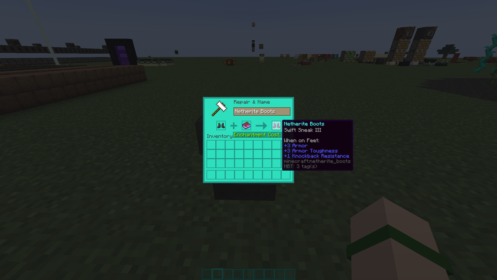 The Swift Sneak enchantment was made to be applied to leggings in the latest snapshot (22w12a as of making this bug report). However, through the anvil, Swift Sneak can be applied to boots as well. The enchantment does not do anything when on boots, but applying the enchantment to boots is not intended as the changelog states that the enchantment is unique to leggings.