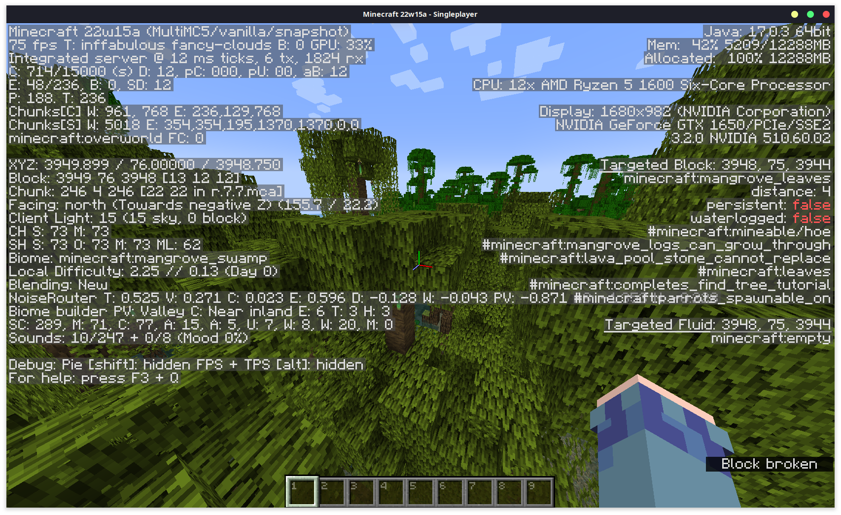 In mangrove swamps, trees very often generate leaves that are disconnected or simply too far away from logs to be supported, which will eventually decay, causing a good deal of lag in mangrove swamps on lower-end devices. A screenshot is attached showing the "Block breaks" subtitle and a propagule item from a leaf block breaking, which is a contributor to lag.